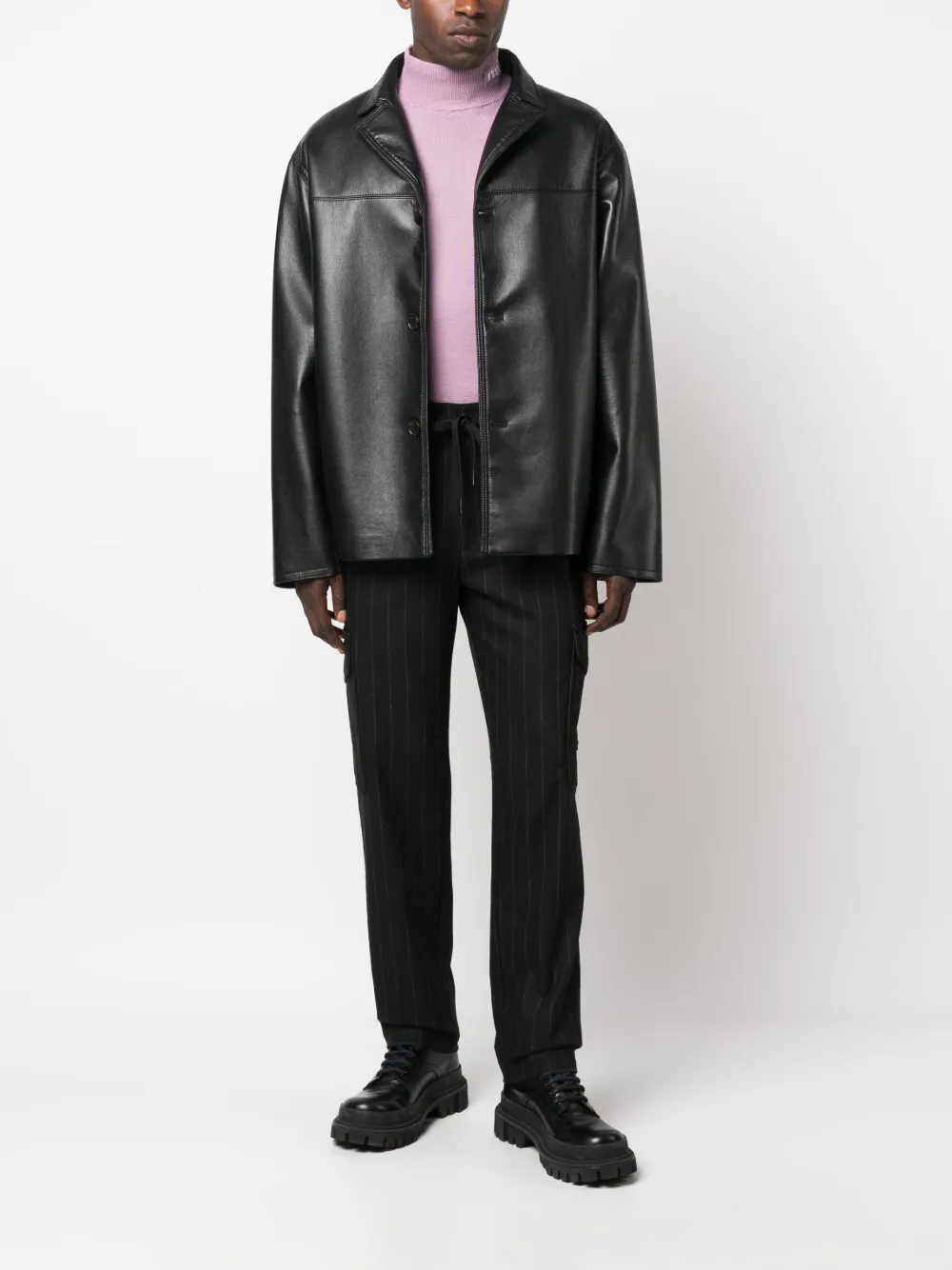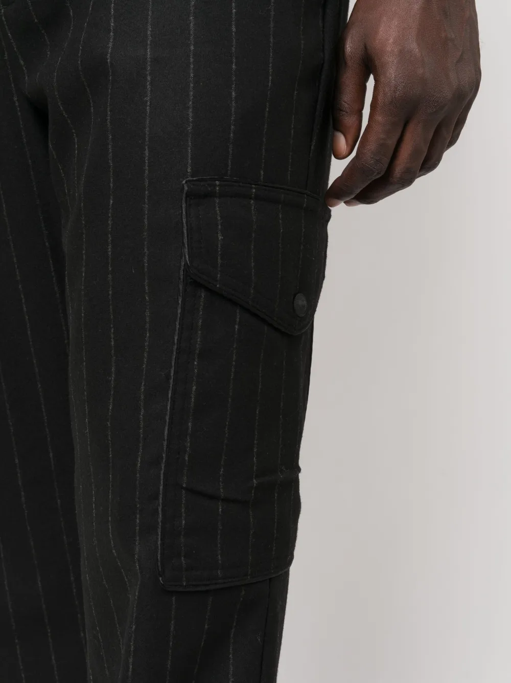 Черный, трикотажный материал, узор в тонкую полоску, нашивка с логотипом сзади, кулиска на талии, застежка на молнии и пуговице спереди, средняя посадка, прямой крой, два накладных кармана по бокам, два вшитых кармана по бокам и карман на молнии сзади.