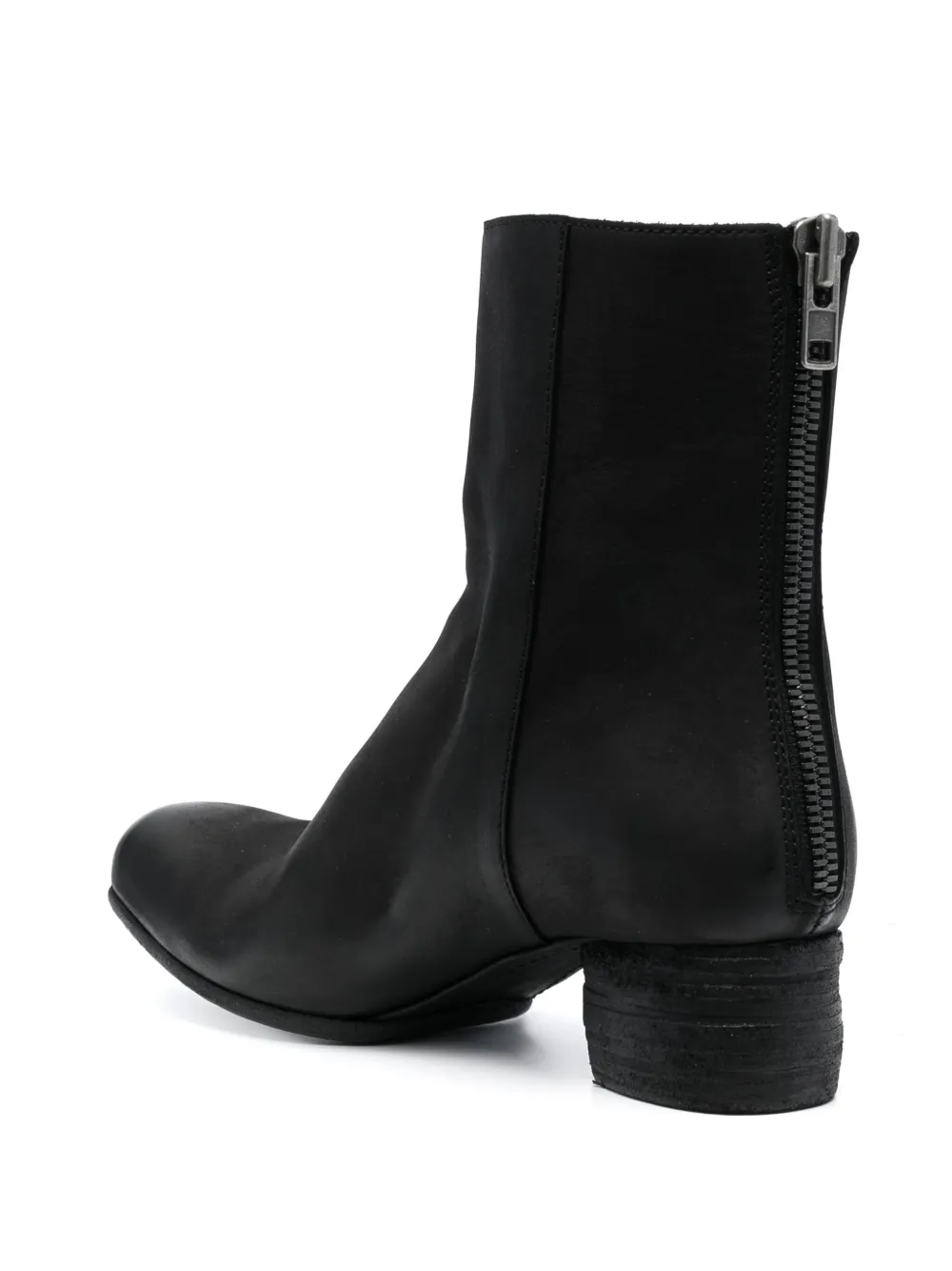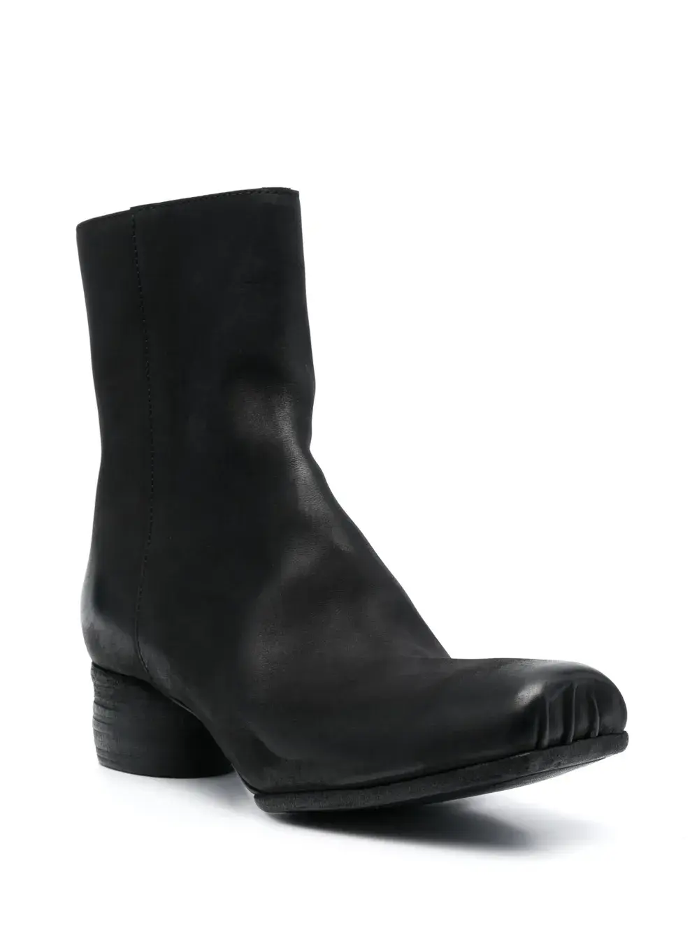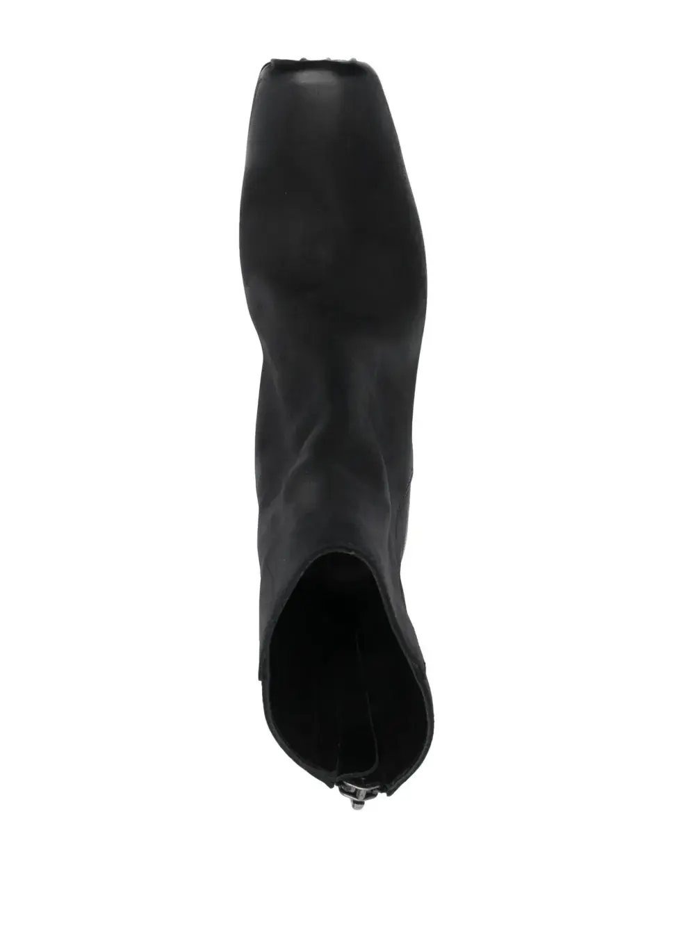 Черный, телячья кожа, серебристая фурнитура, квадратный носок, застежка на молнии сзади, высота по щиколотку и низкий блочный каблук.