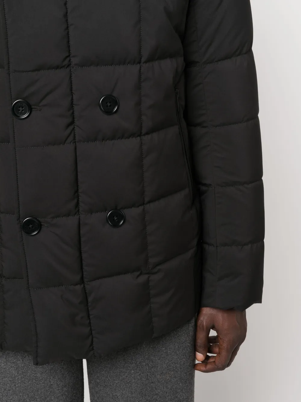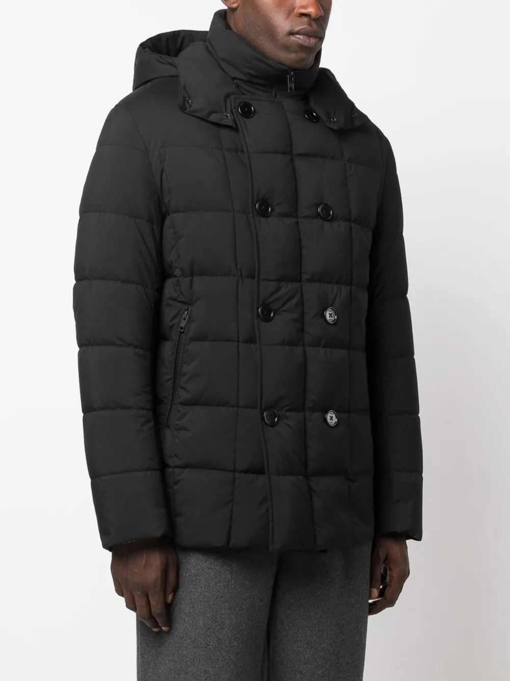 Черный, наполнитель из пуха и перьев, дутый материал, классический капюшон, высокий воротник, двубортная застежка на кнопки, два кармана на молнии по бокам, длинные рукава и прямой подол.