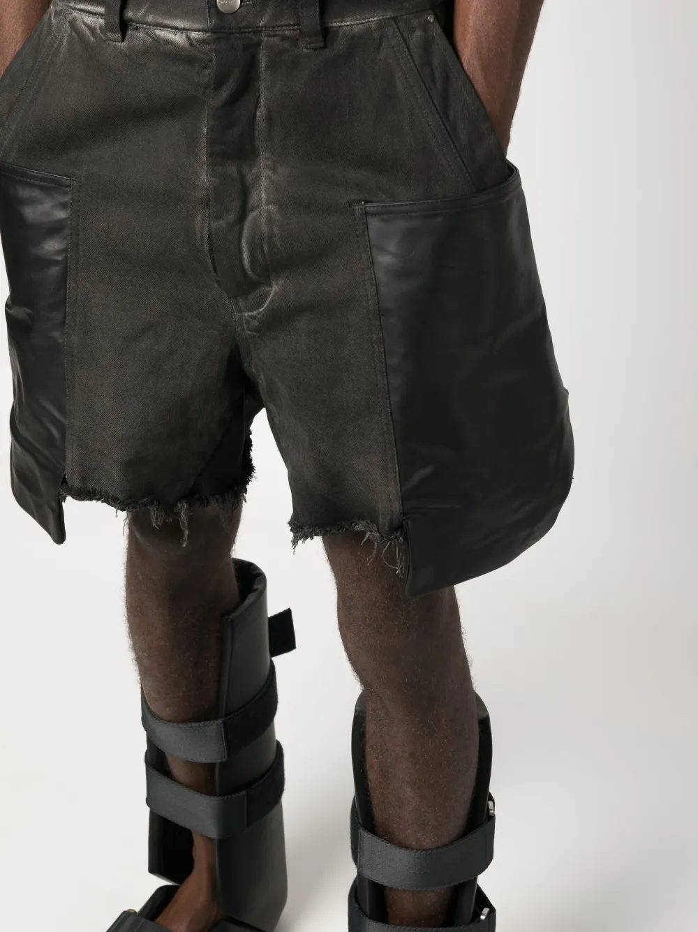 Черный, смесовый хлопок, телячья кожа, вставки, швы, отделка металлическими люверсами, петли для ремня, длина выше колена, два прорезных кармана по бокам, два накладных кармана по бокам, потайная застежка на молнии и пуговицах и необработанные края.