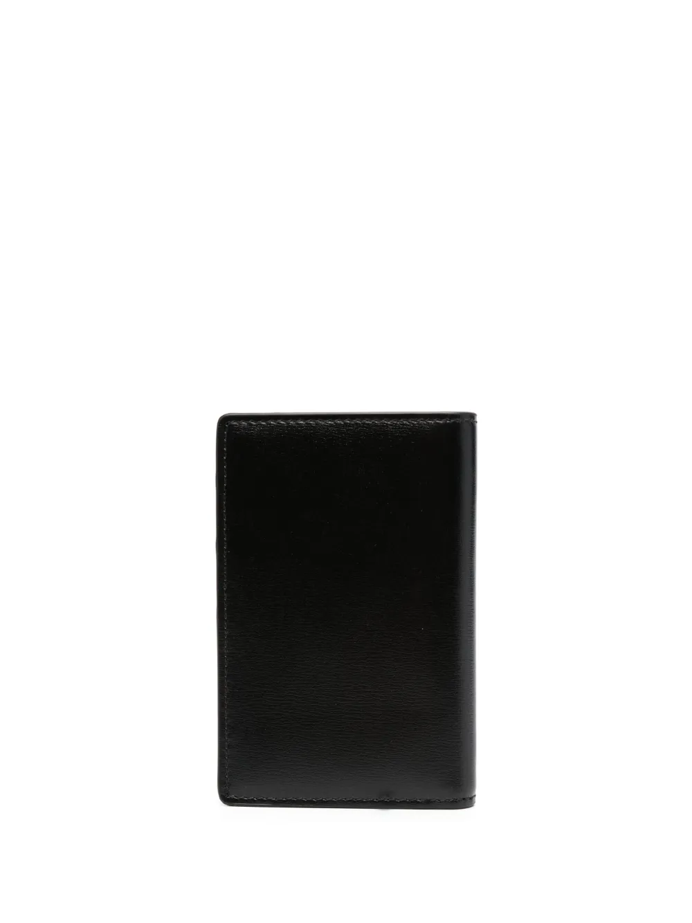 Черный, телячья кожа, золотистый металлический логотип, два сложения, тисненый логотип внутри и внутренние отделения для карт.