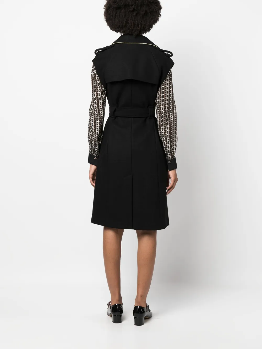 Черный, серебристая фурнитура, контрастные вставки, штормовая заслонка, эполеты, широкие зазубренные лацканы, без рукавов, ремень на талии, два кармана с клапанами по бокам и длина по колено.