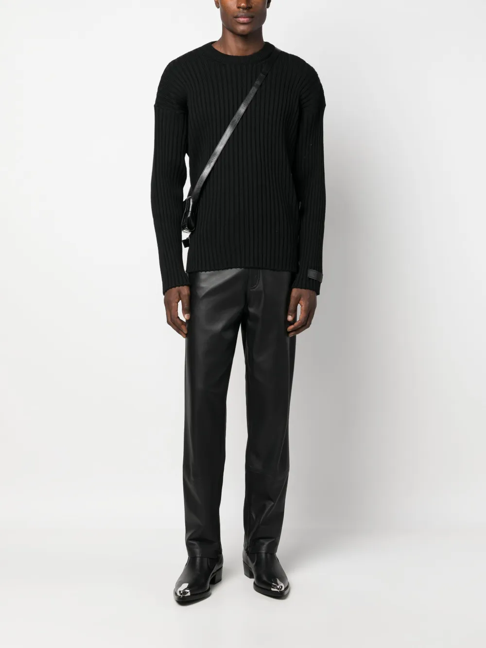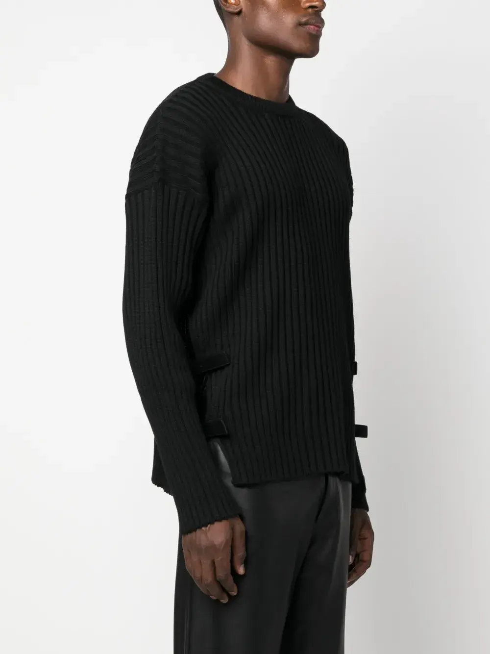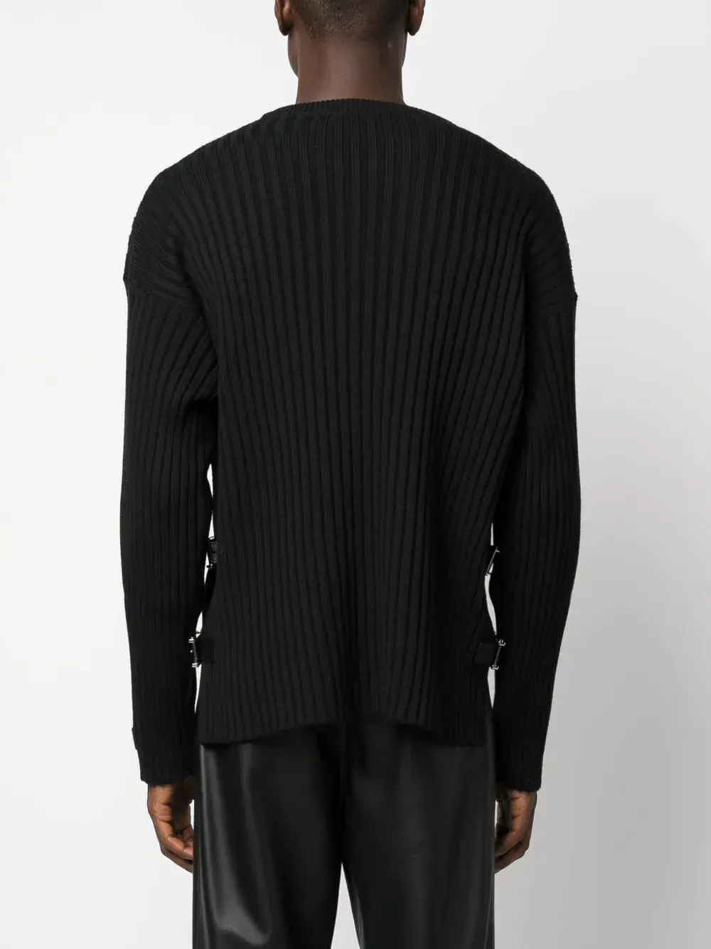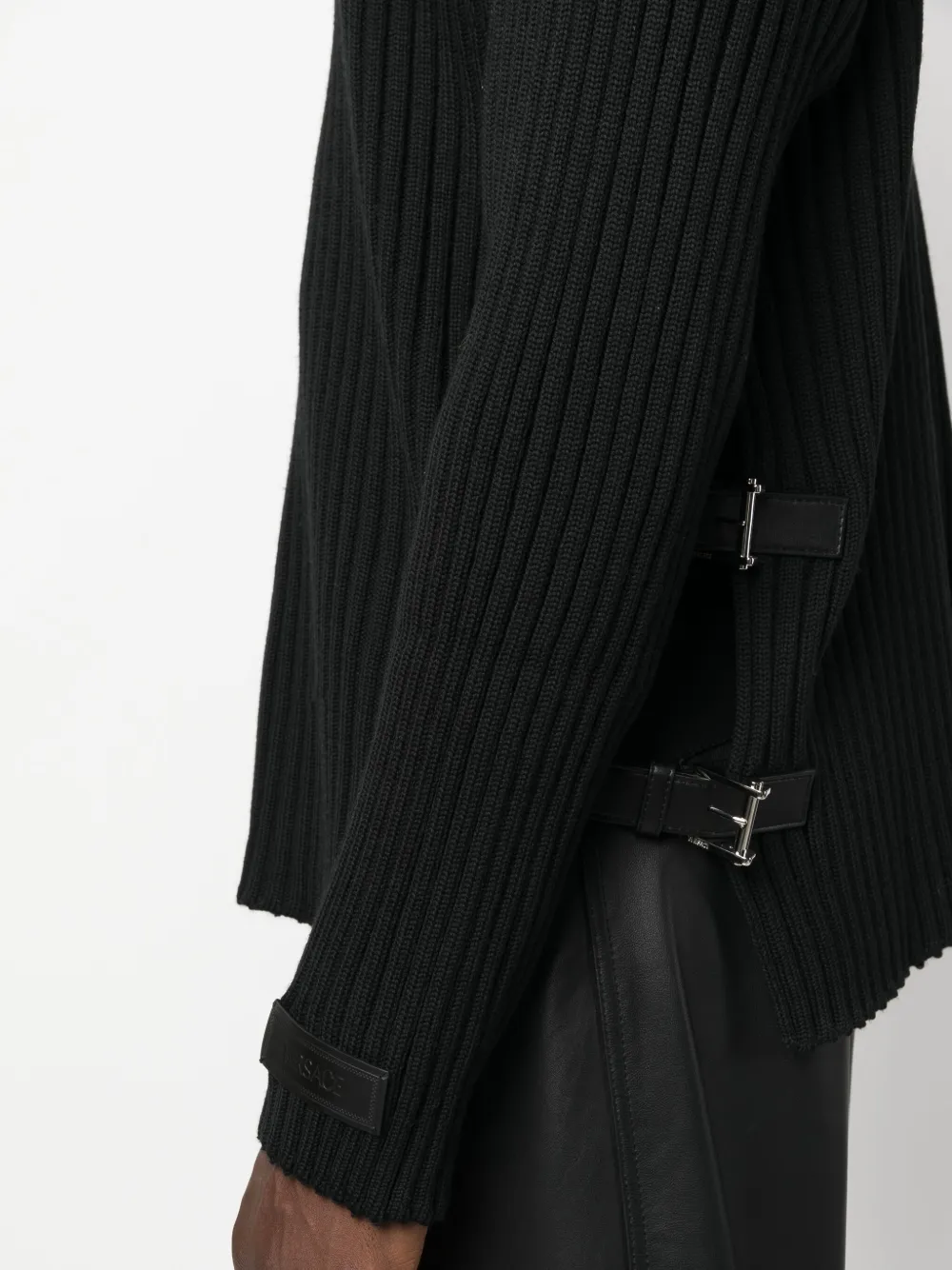 Черный, шерсть, трикотаж в крупный рубчик, боковые разрезы, декоративные пряжки, кожаная отделка, круглый вырез, приспущенные плечи, длинные рукава и прямой подол.