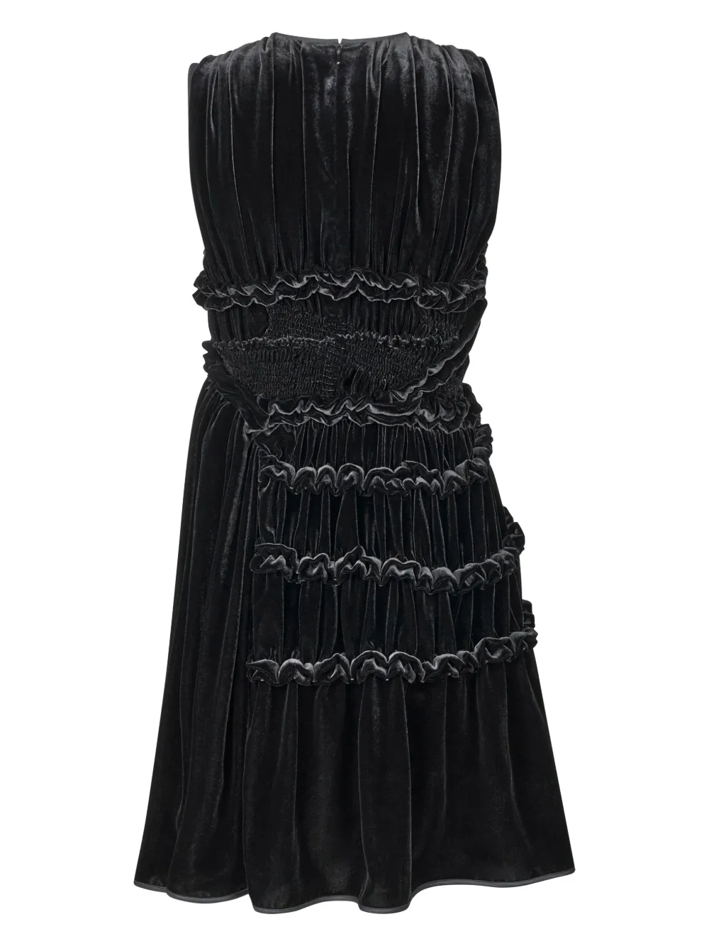 Черный, бархат, плиссированная модель, вставки с оборками, круглый вырез, потайная застежка на молнии сзади, без рукавов, сборка на талии, А-образный силуэт, длина миди и прямой подол.