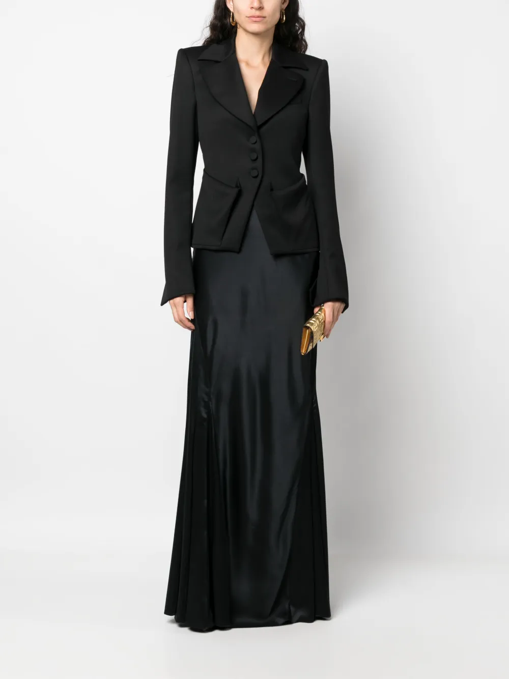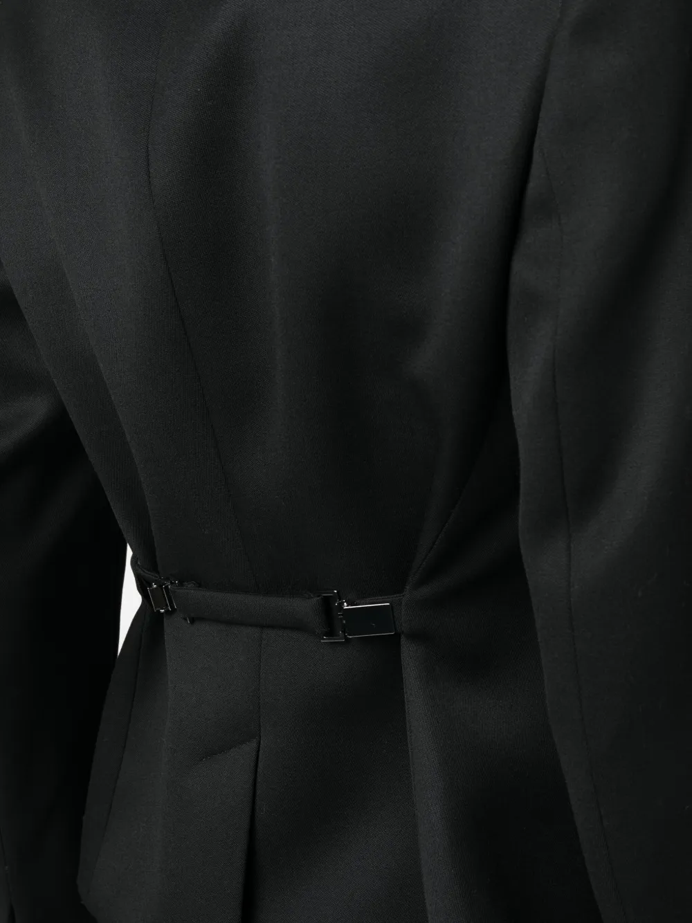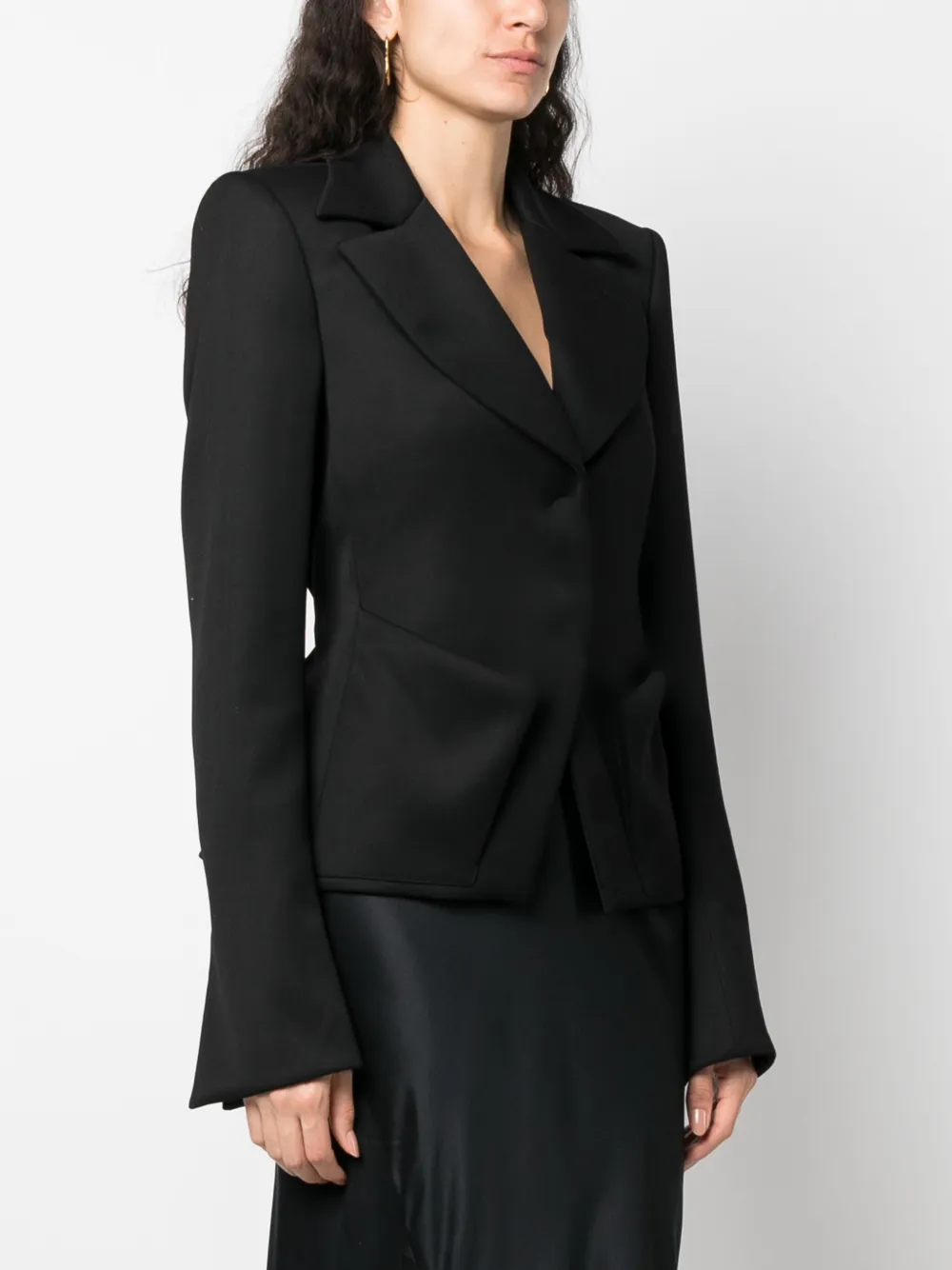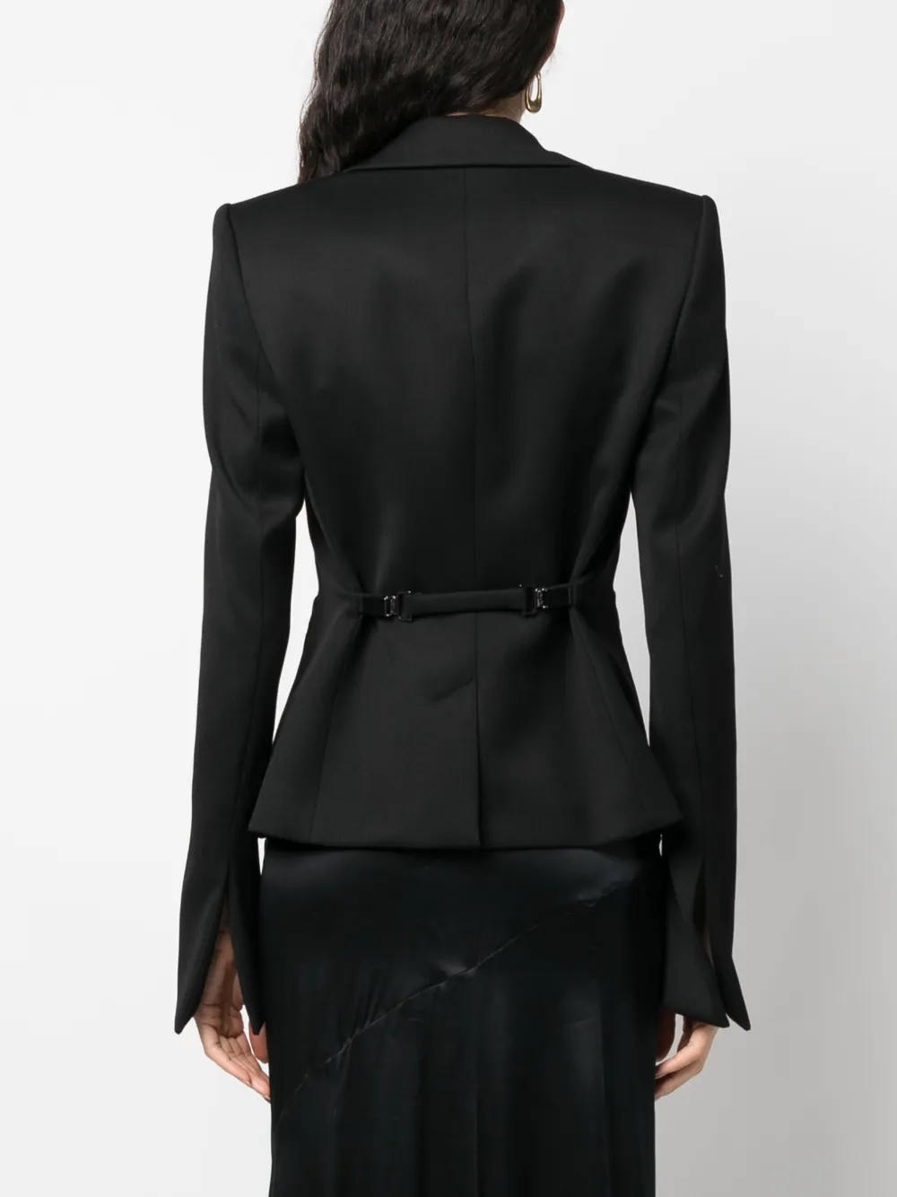 Черный, необработанная шерсть, строгий крой, широкие зазубренные лацканы, застежка на пуговицах спереди, подплечники, длинные рукава, манжеты с разрезами, регулируемый ремешок сзади, прорезной карман на груди и два накладных кармана спереди.