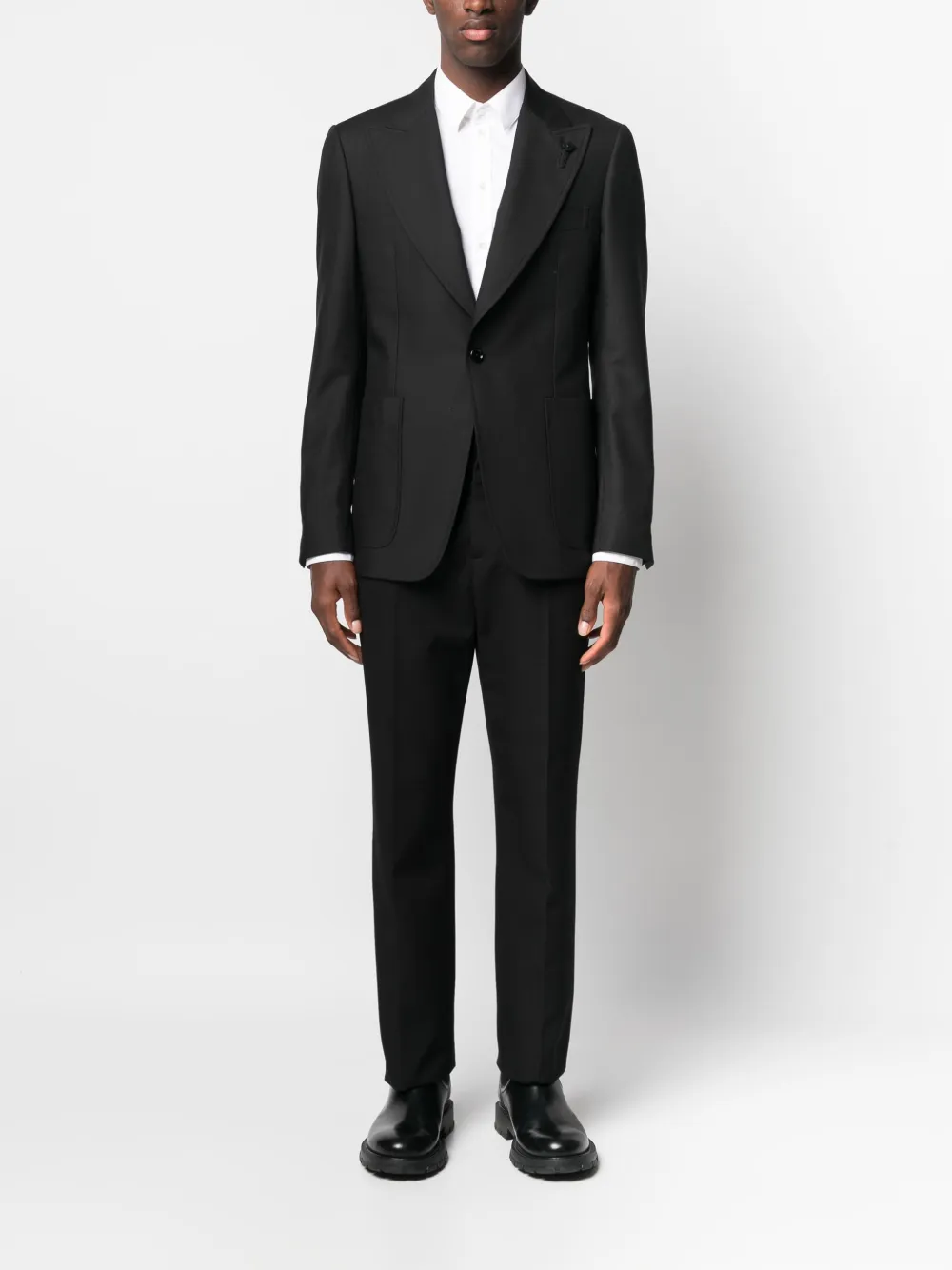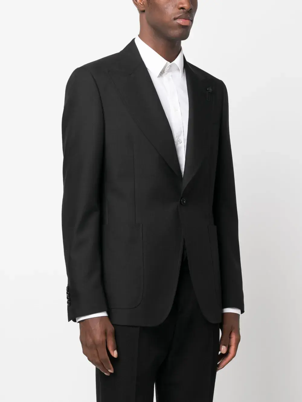Черный, смесь шерсти и мохера, декоративная булавка, серебристый металлический логотип, заостренные лацканы, V-образный вырез, длинные рукава, манжеты на пуговицах, застежка на пуговицах спереди, два накладных кармана, прорезной карман на груди и прямой подол.