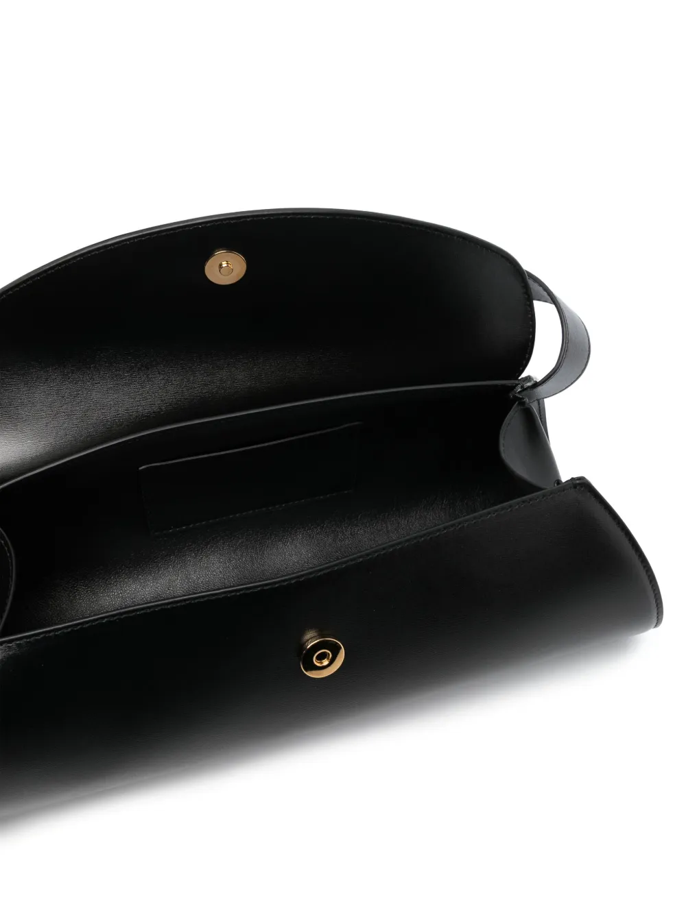 Черный, телячья кожа, тисненый логотип спереди, золотистая фурнитура, откидной клапан на магните, регулируемый ремень на плечо и основное отделение.