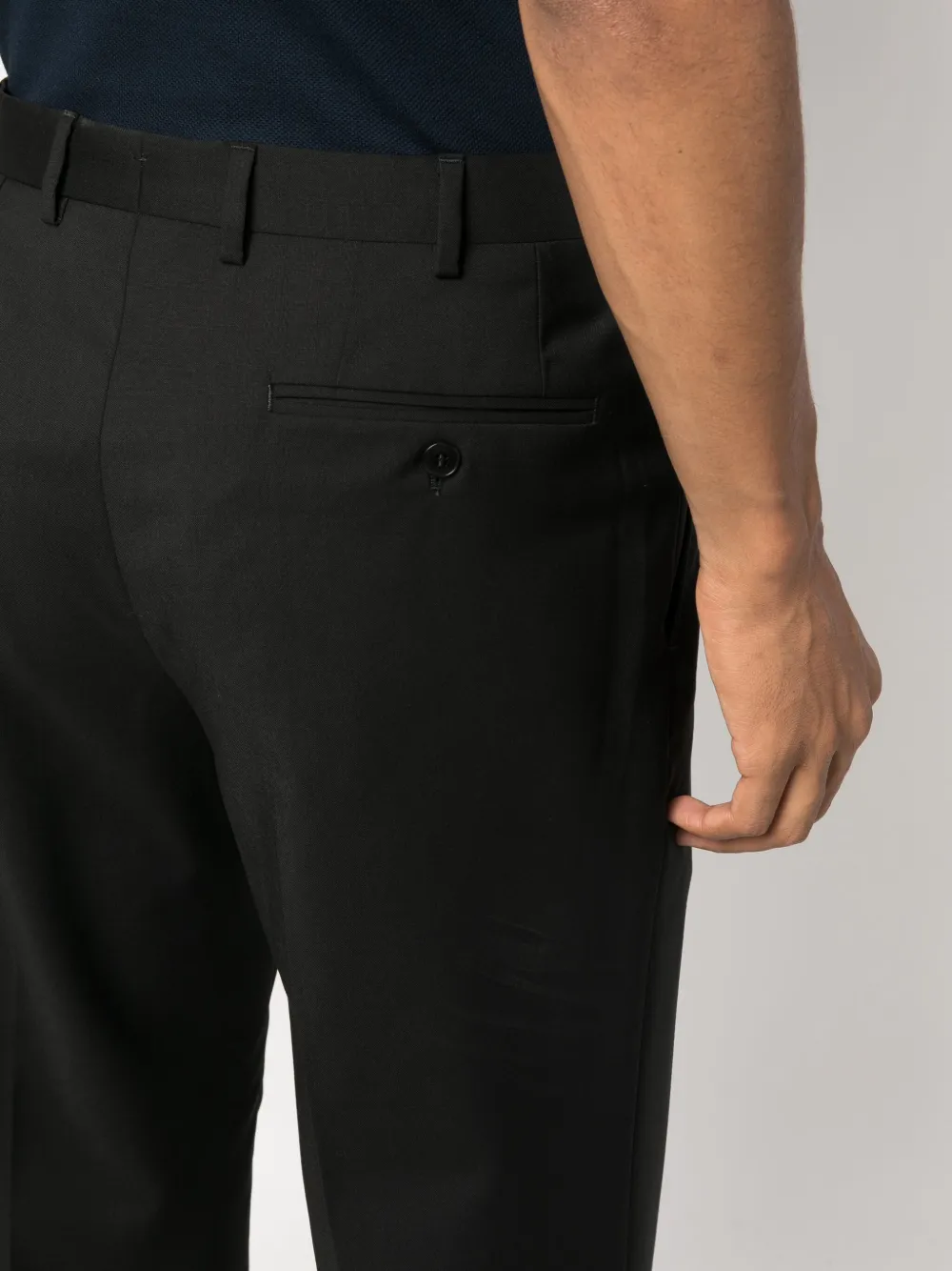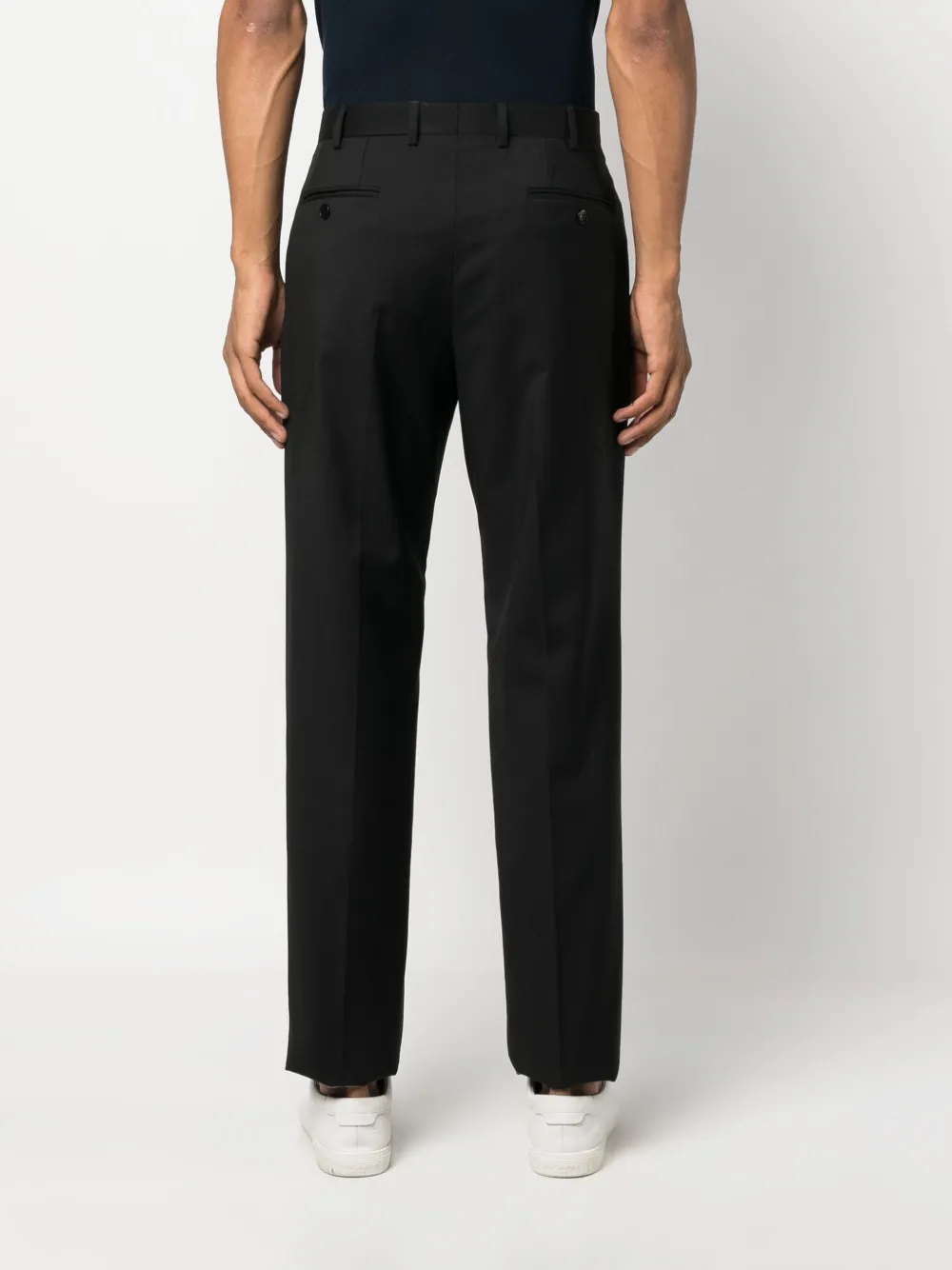Черный, необработанная шерсть, классический крой, петли для ремня, смещенная застежка на пуговицах спереди, прямой крой, два прорезных кармана по бокам, два прорезных кармана на пуговицах сзади и высота по щиколотку.