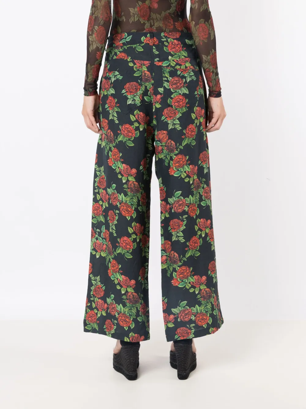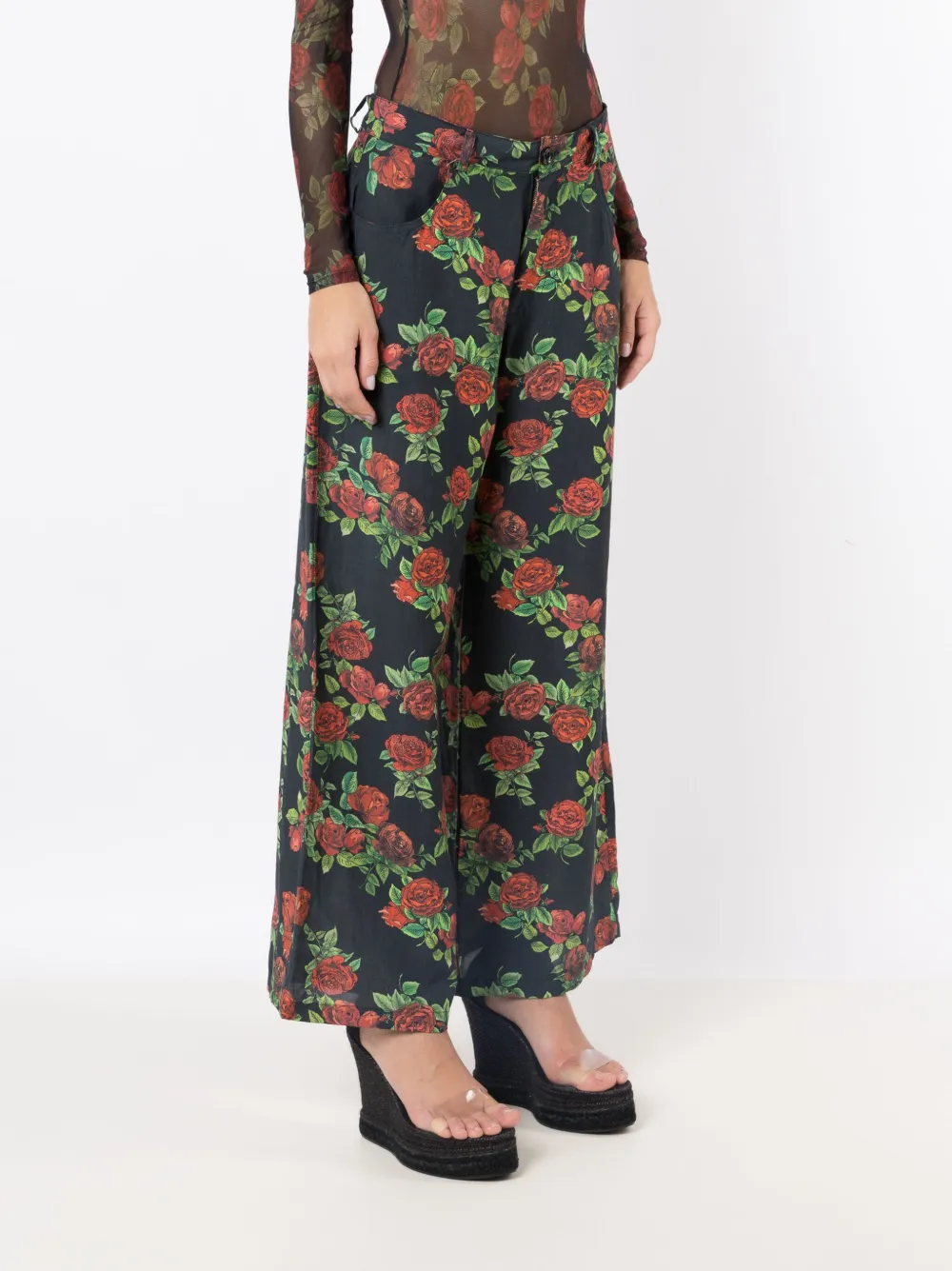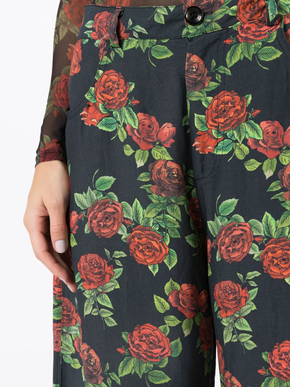Сплошной цветочный принт, средняя посадка, петли для ремня, застежка на молнии и пуговице спереди, два вшитых кармана по бокам и два накладных кармана сзади.