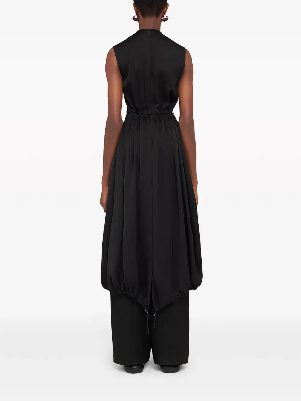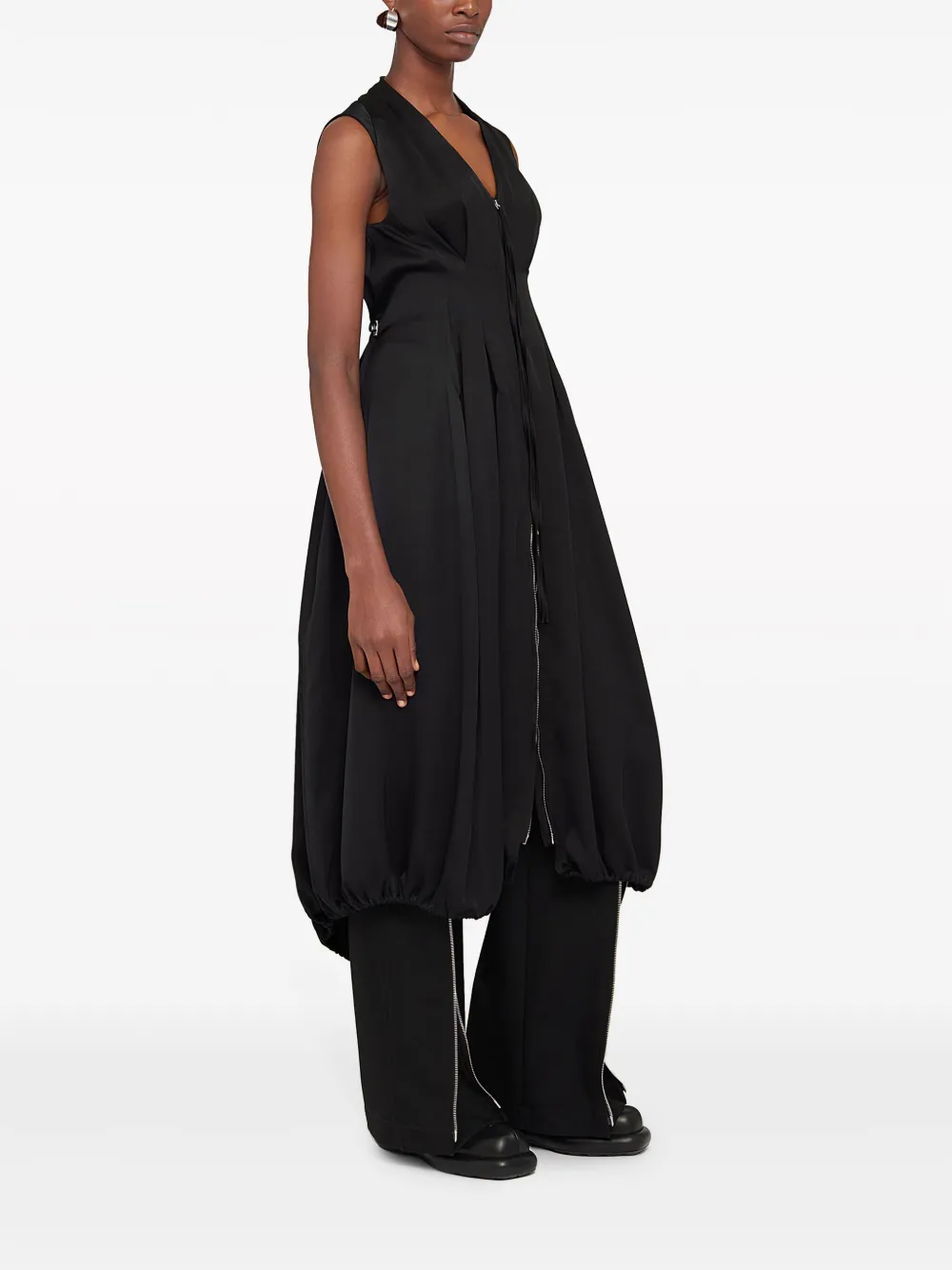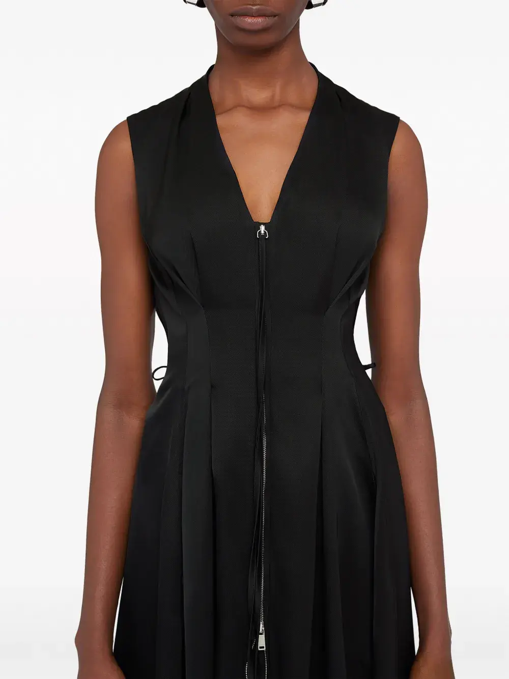 Черный, плиссированная юбка, приталенный силуэт, V-образный вырез, без рукавов, застежка на молнии спереди, длина ниже колена и асимметричный подол.