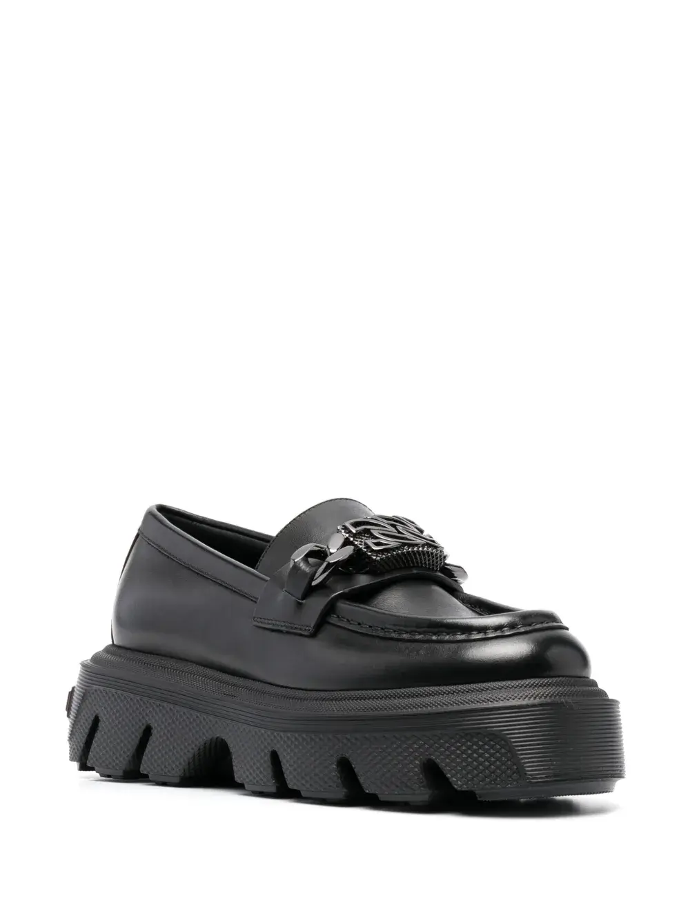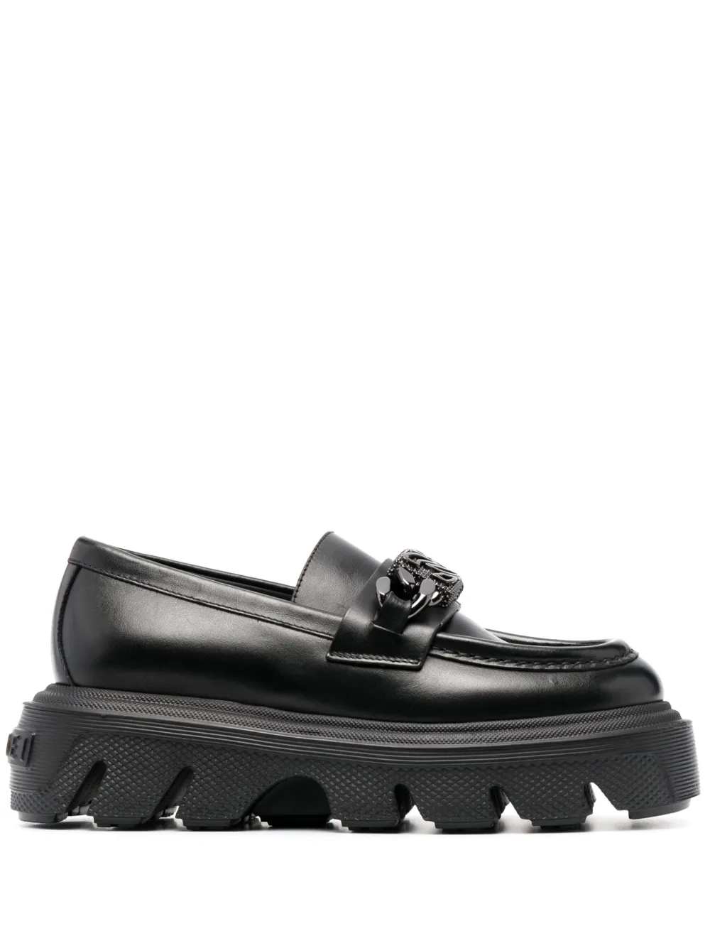 Черный, телячья кожа, металлический логотип, цепочка, логотип на подошве, закругленный носок, модель без застежки, стелька с логотипом и плоская резиновая подошва.