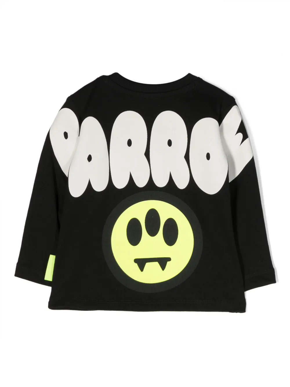 Черный, хлопок, вышитый логотип на груди, принт с логотипом сзади, принт с изображением смайла, круглый вырез, застежка на кнопках на плече, длинные рукава и прямой подол.
