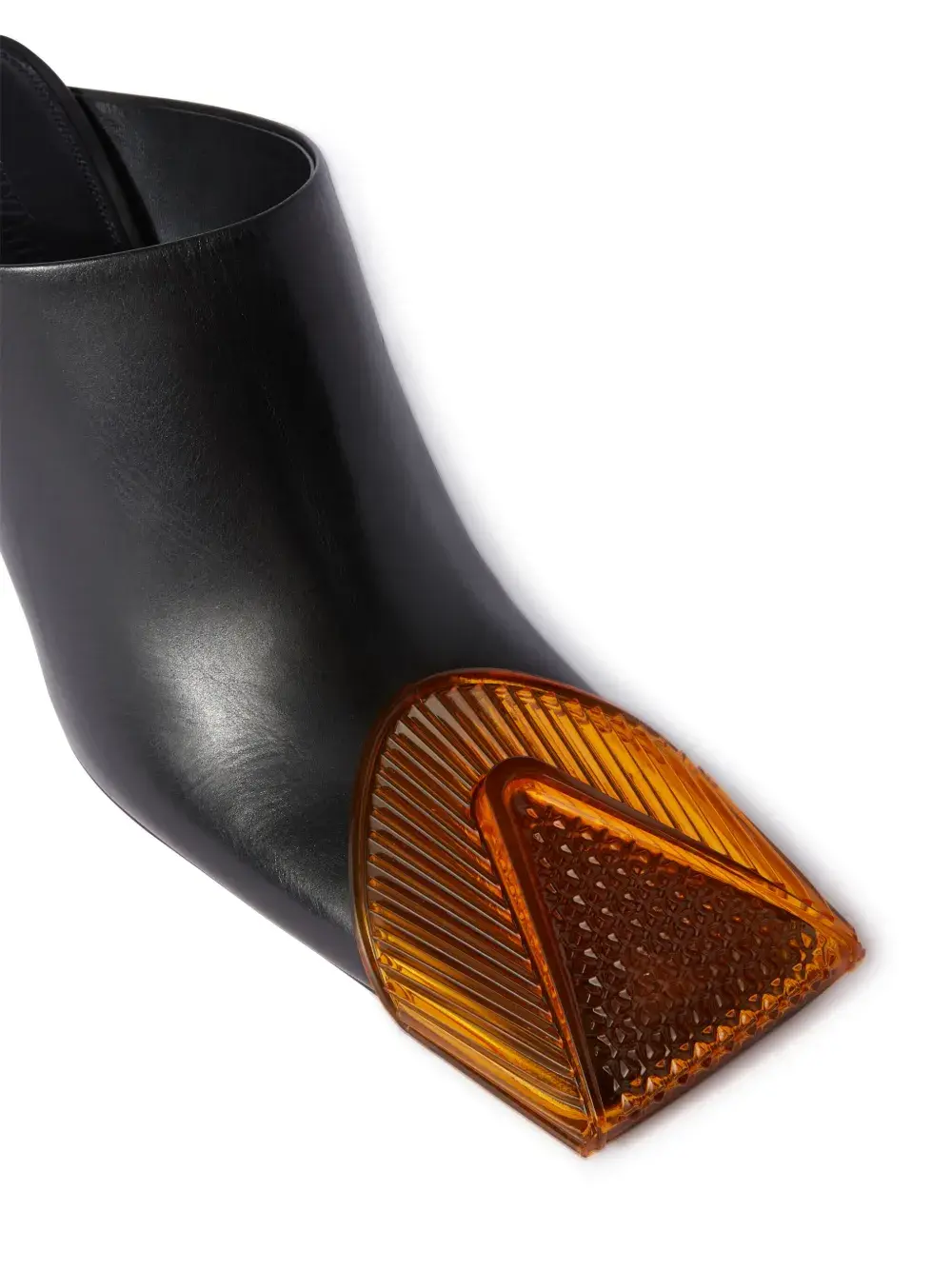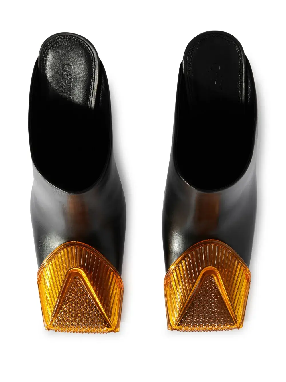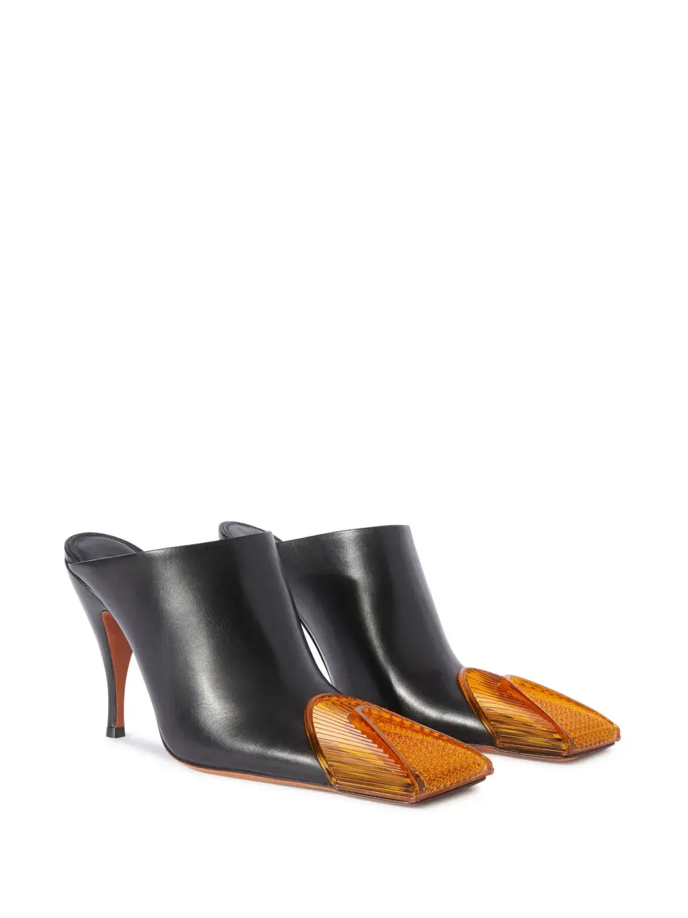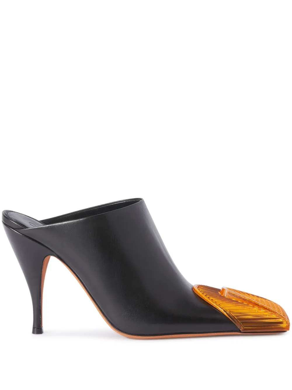 Черный, оранжевый, кожа, гладкая текстура кожи, логотип на стельке, квадратный носок и высокий скульптурный каблук.