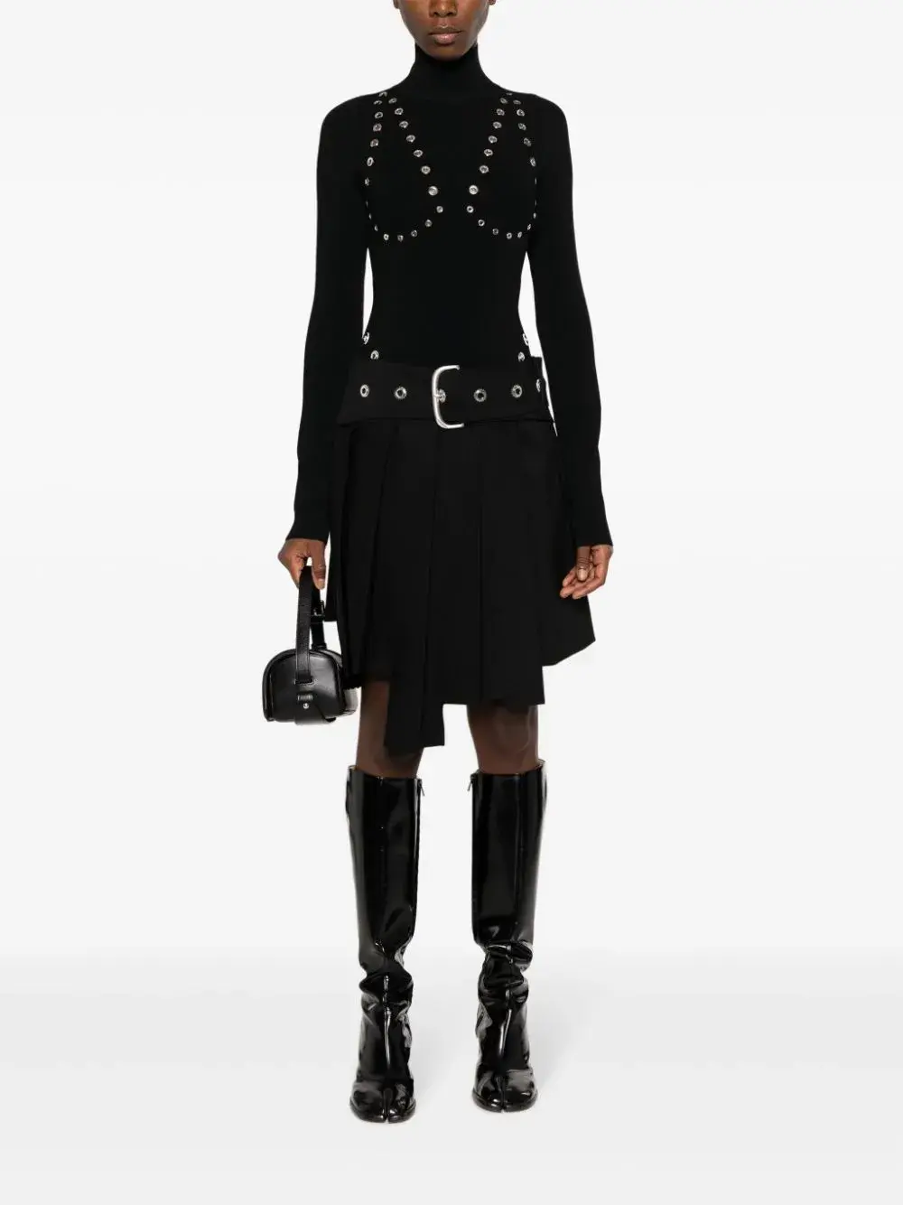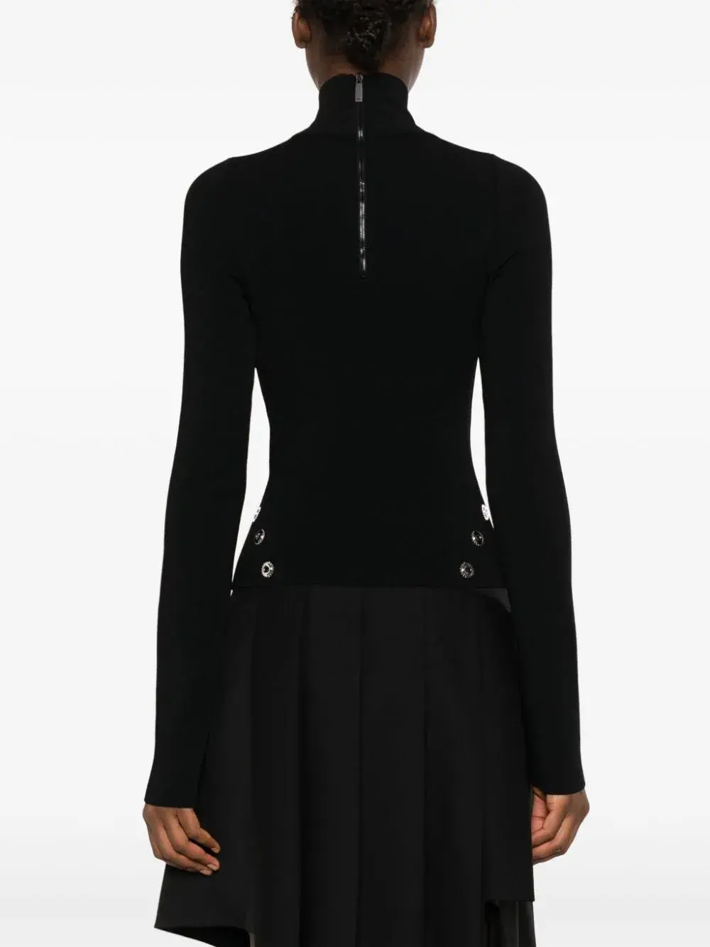 Черный, трикотажный материал, люверсы, серебристая фурнитура, высокий воротник, длинные рукава, короткая застежка на молнии и прямой подол.