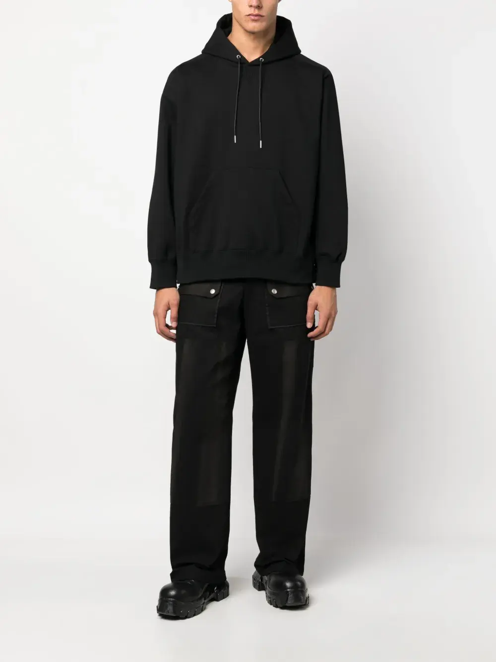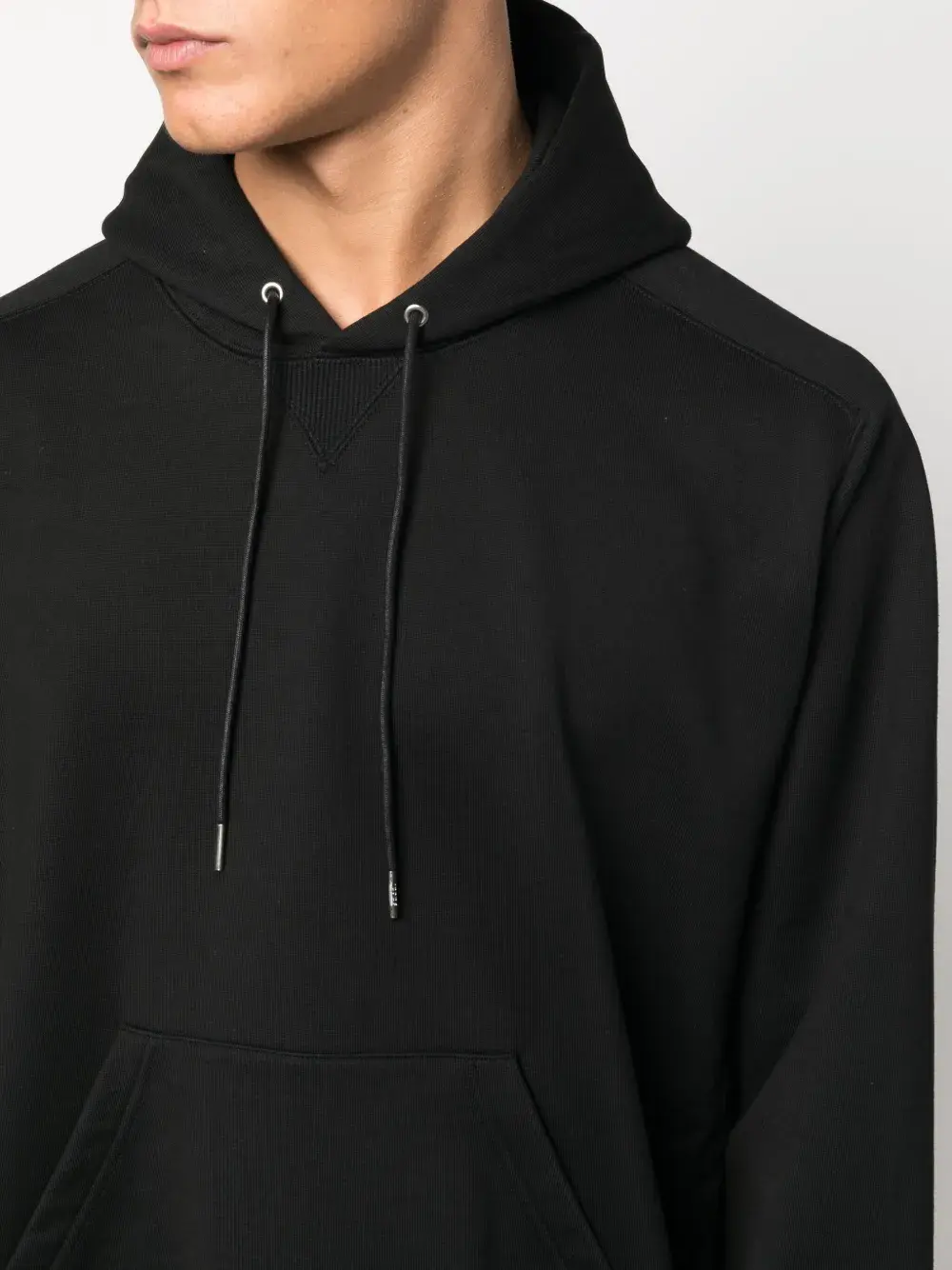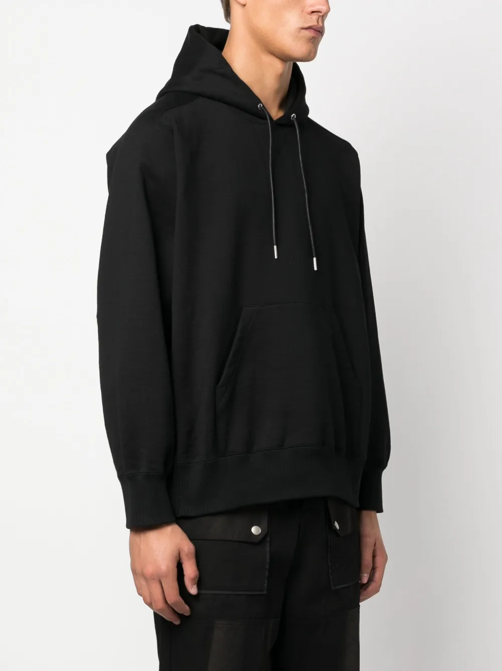 Черный, хлопок, однотонная расцветка, затягивающийся на шнурок капюшон, длинные рукава, прямой подол и карман-муфта.