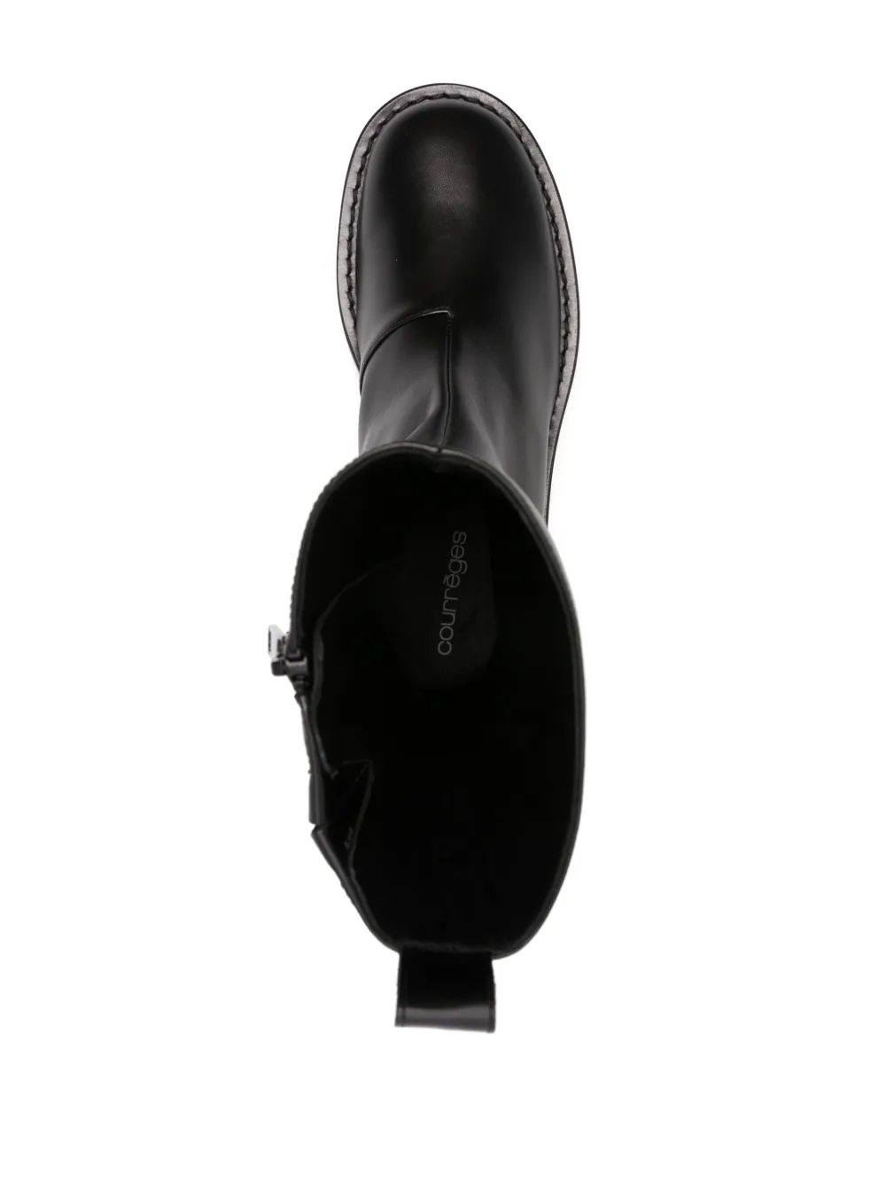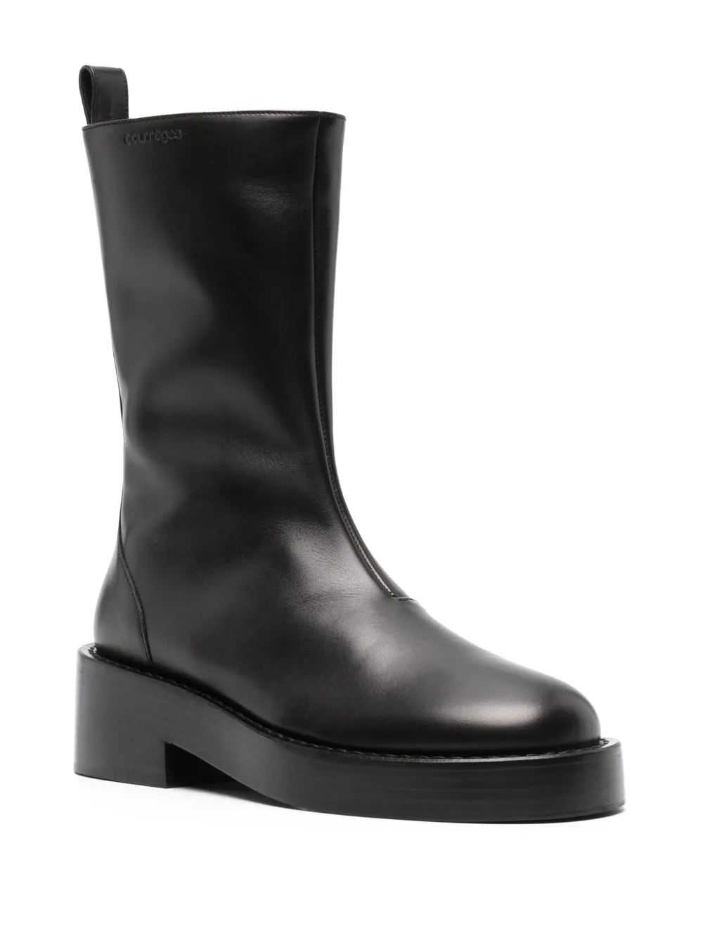 Черный, телячья кожа, тисненый логотип сбоку, серебристый металлический логотип, петля для подтягивания сзади, закругленный носок, застежка на молнии сбоку и низкий блочный каблук.