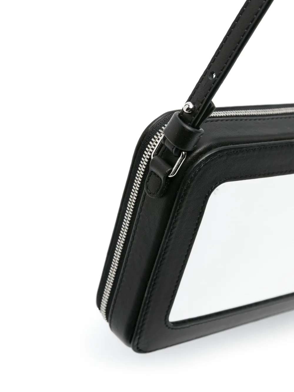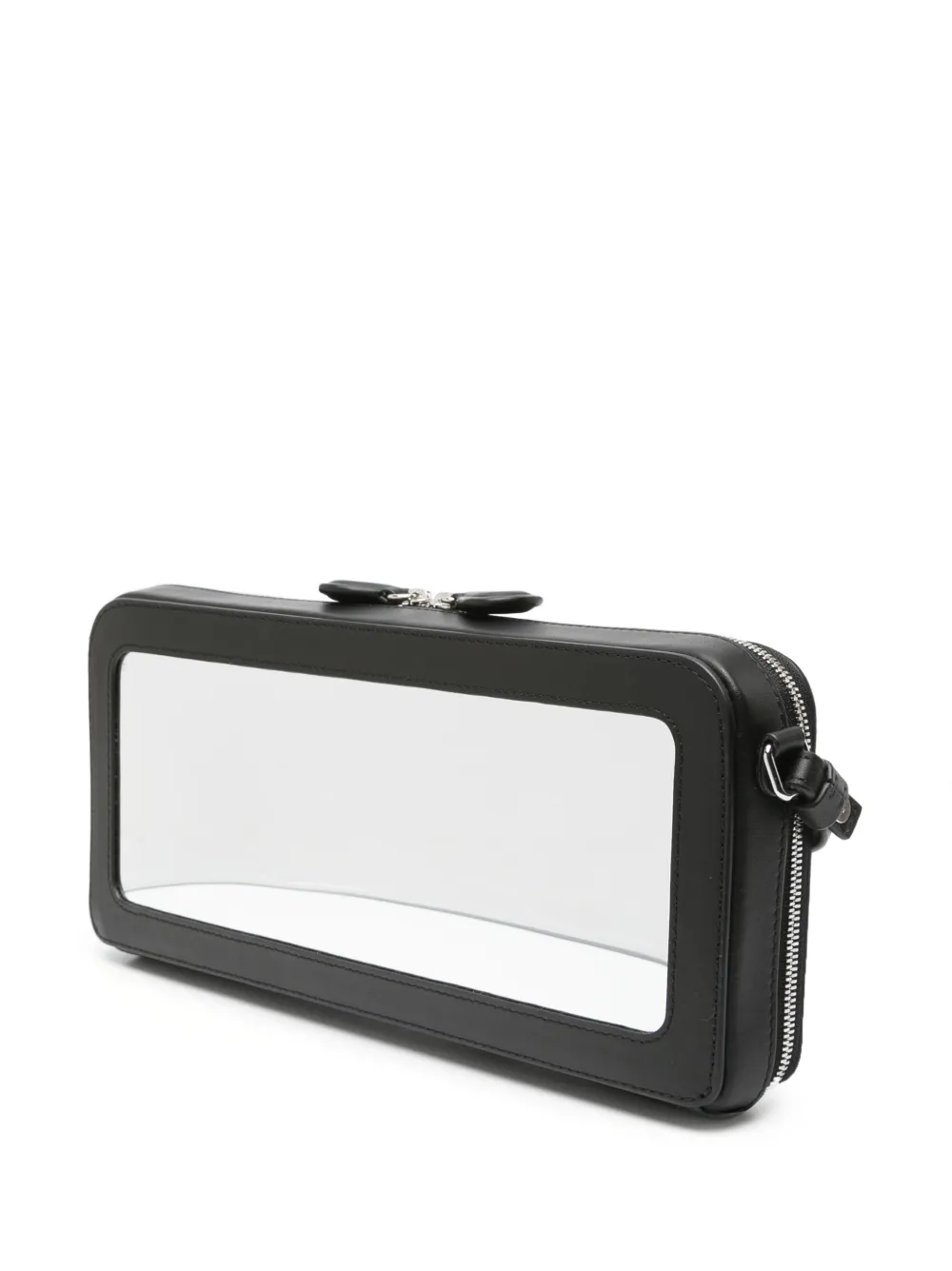 Черный, телячья кожа, серебристая фурнитура, серебристый металлический логотип, съемный ремень на плечо, зеркальное стекло, круговая молния, основное отделение и внутренний прорезной карман.