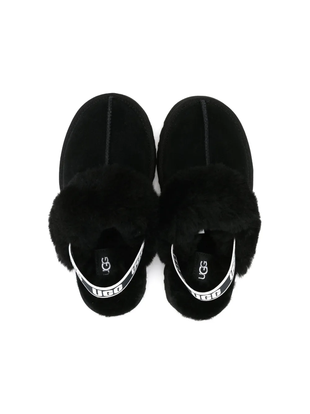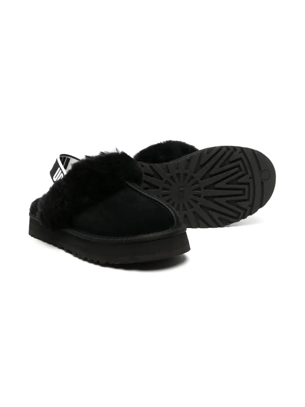 Черный, замша, подкладка из овечьей шерсти, ремешки с логотипом, эластичный ремешок на пятке, закругленный носок, промежуточная подошва из этиленвинилацетата (EVA) и подошва на платформе.