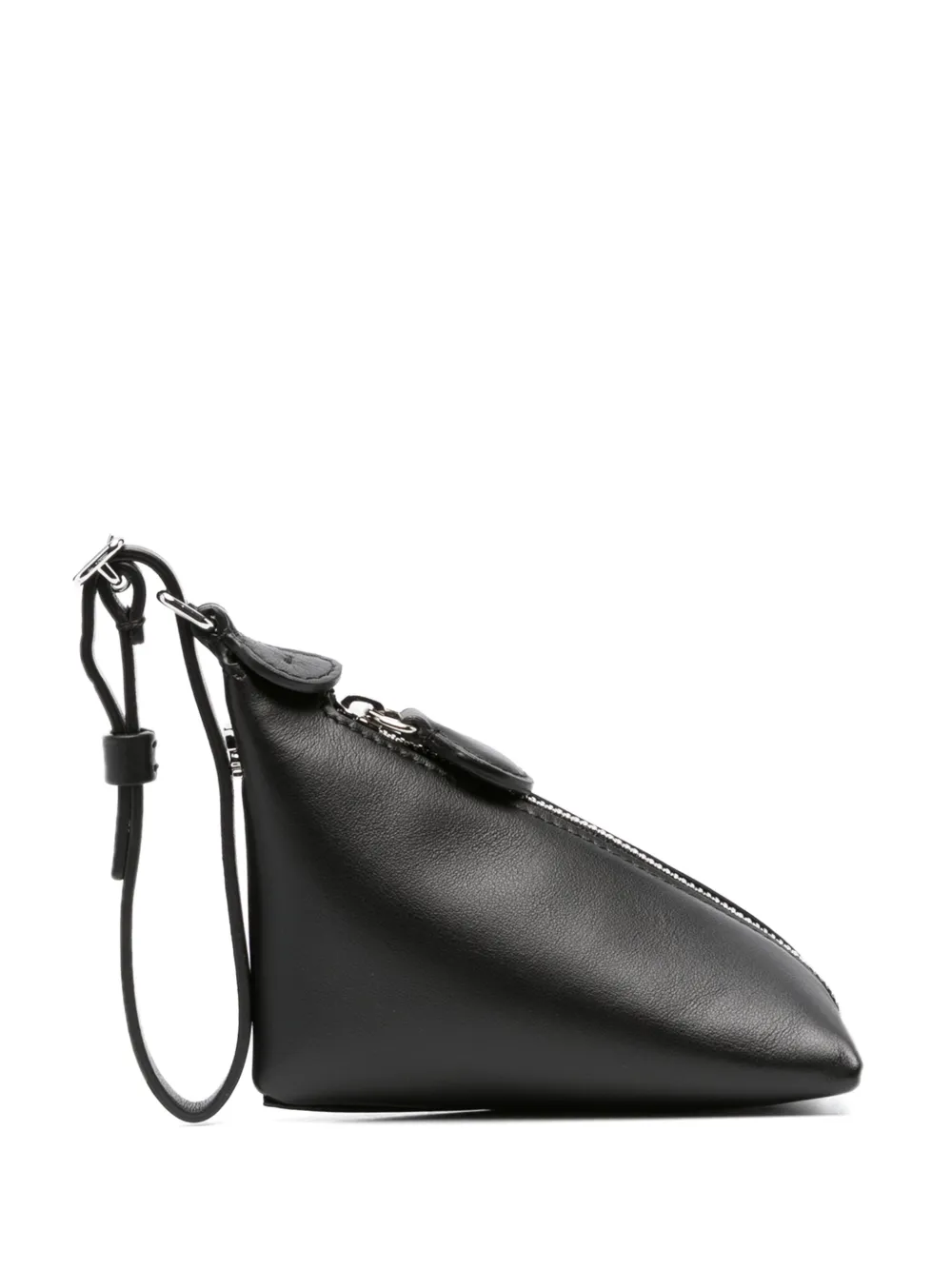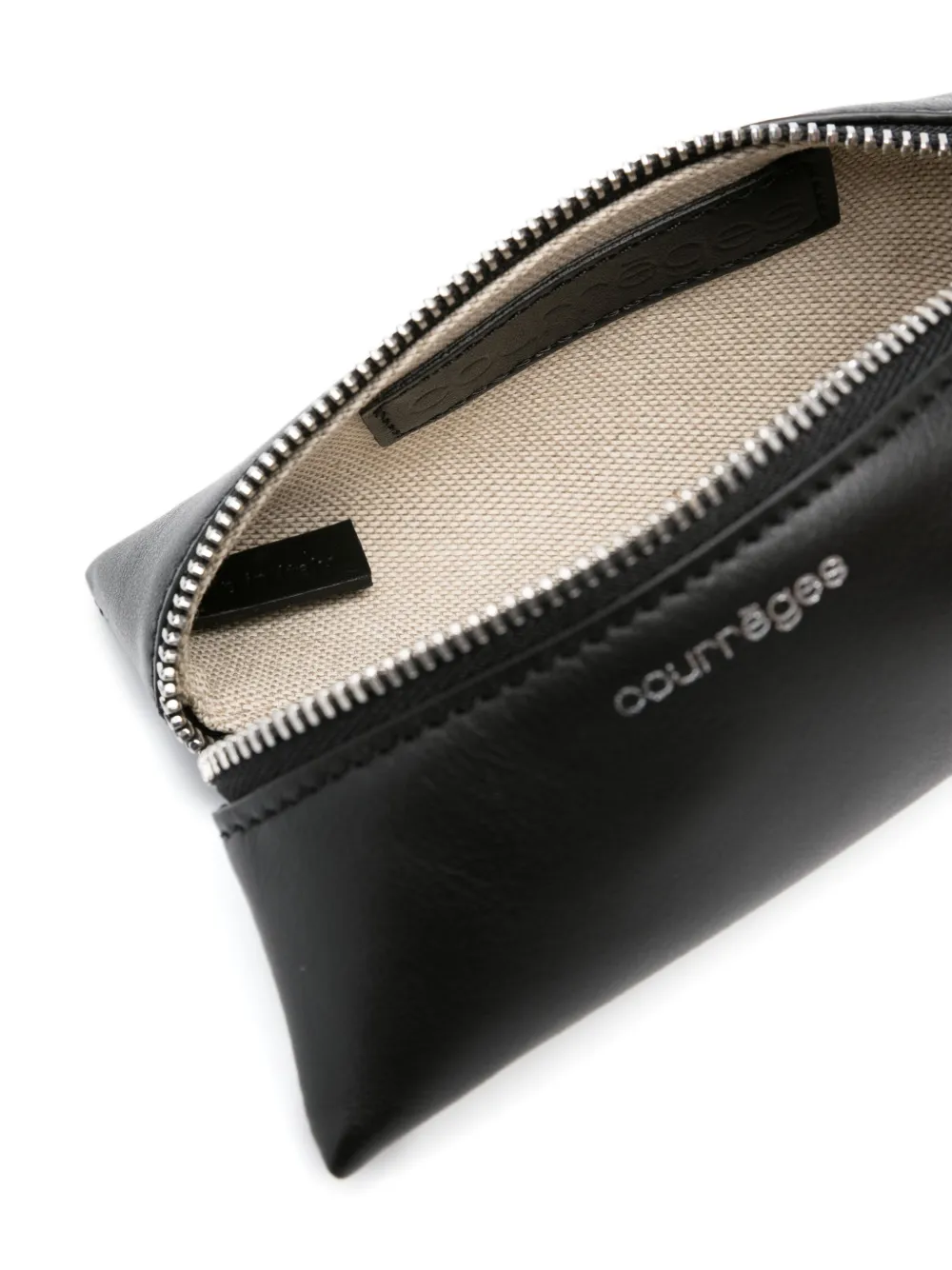 Черный, телячья кожа, серебристый логотип, серебристая фурнитура, застежка на молнии сверху, съемный ремешок на запястье, основное отделение, нашивка с логотипом внутри и подкладка из хлопка.