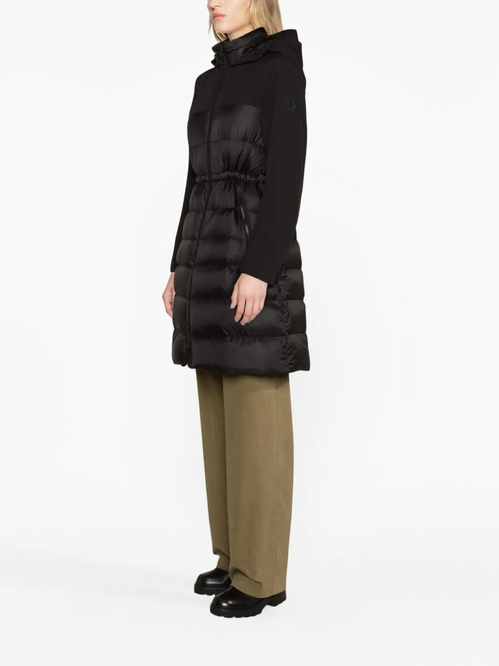 Стрейчевая ткань, стеганые вставки, дутый материал, вставки, нашивка с логотипом на рукаве, воротник-труба, затягивающийся на шнурок капюшон, двусторонняя молния спереди, длинные рукава и длина до бедер.