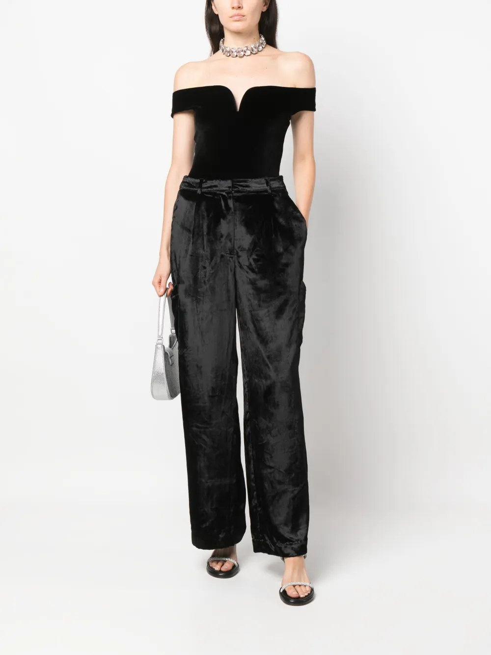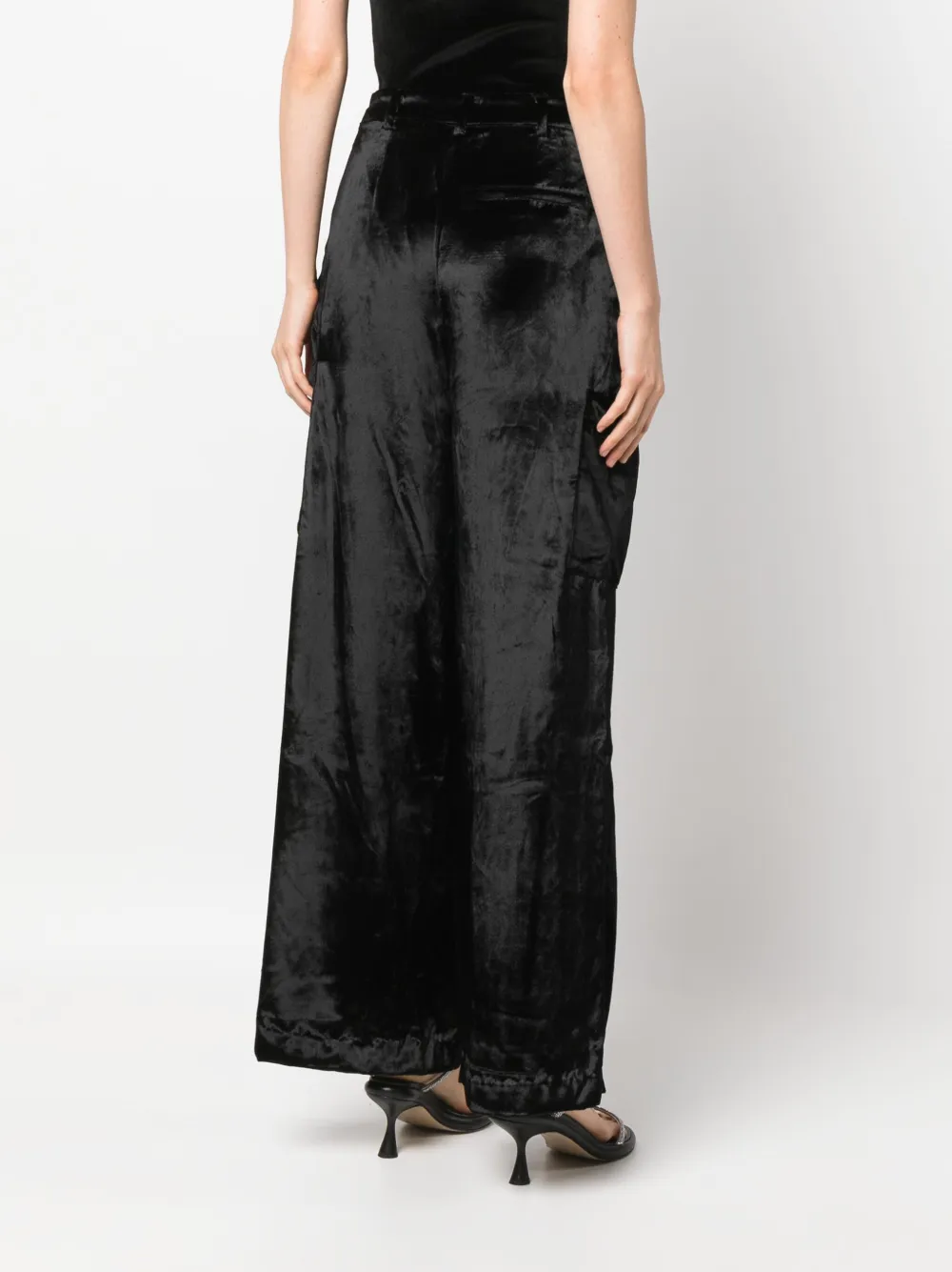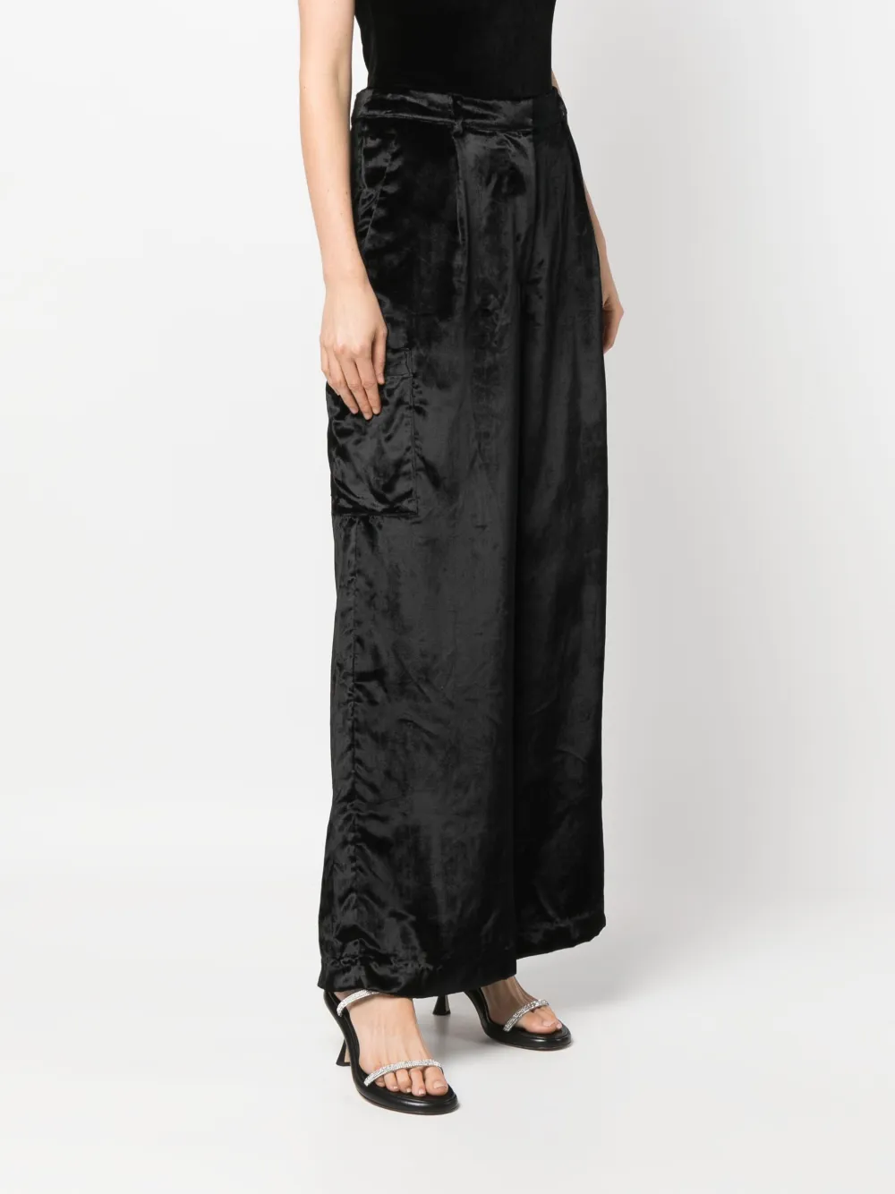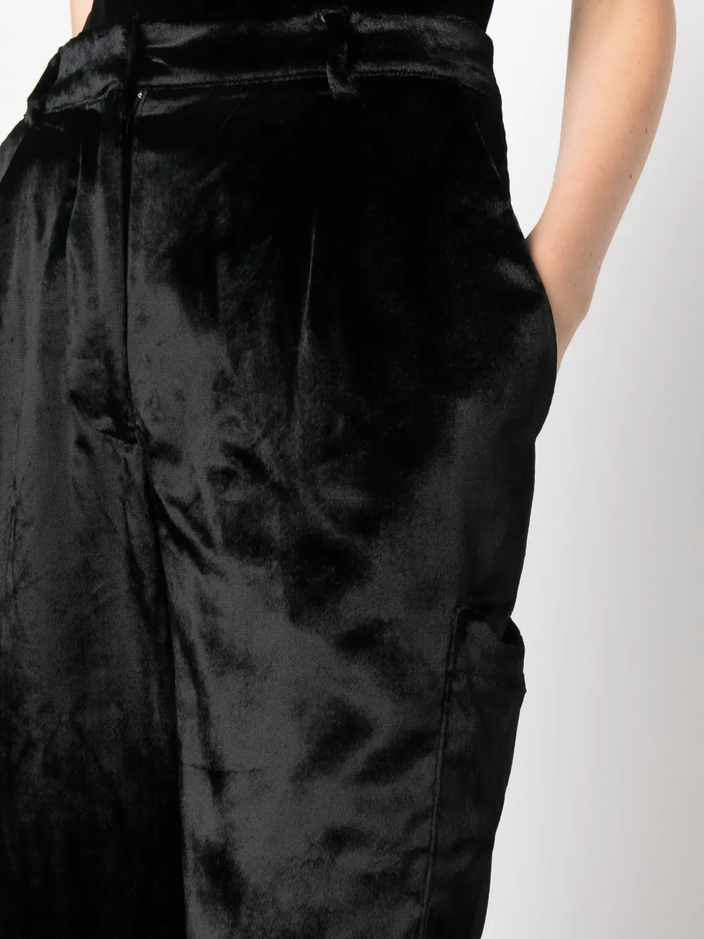 Бархатный эффект, складки, потайная застежка спереди, два вшитых кармана по бокам и два накладных кармана по бокам.