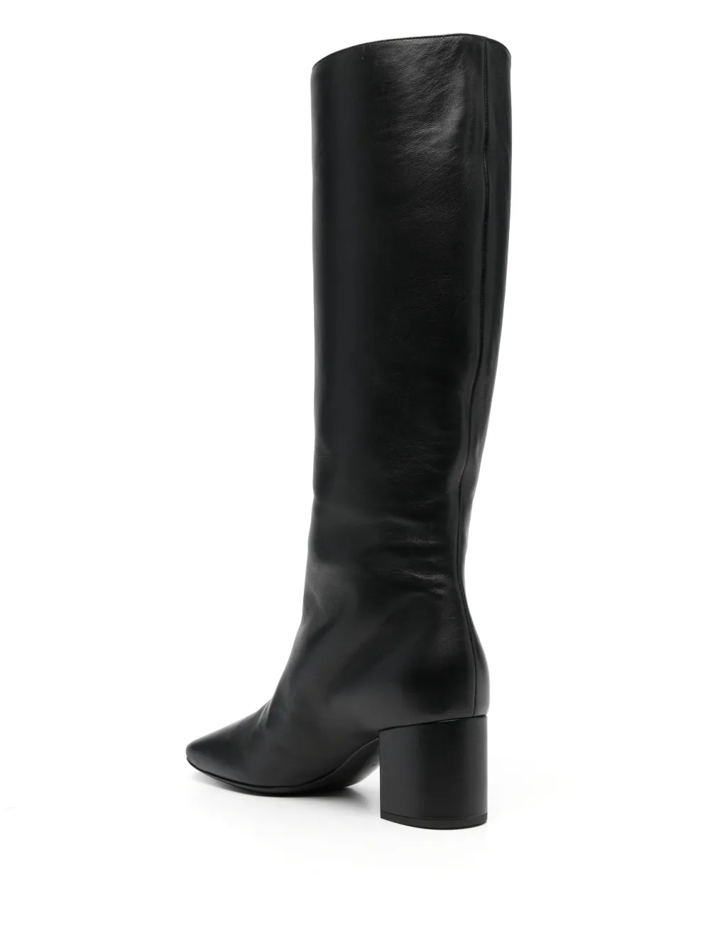 Черный, телячья кожа, золотистый металлический логотип, квадратный носок и низкий блочный каблук.