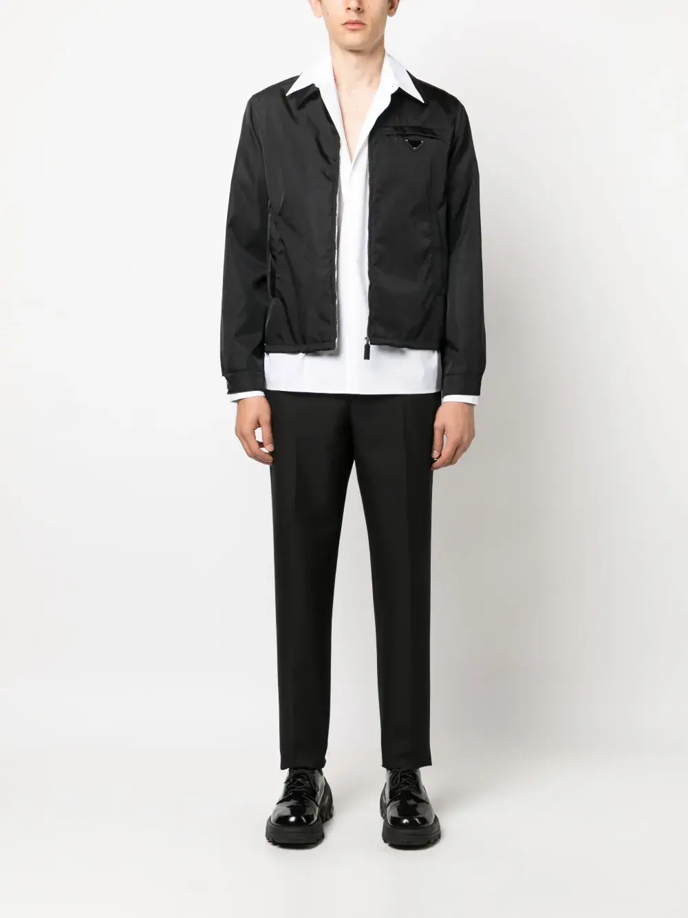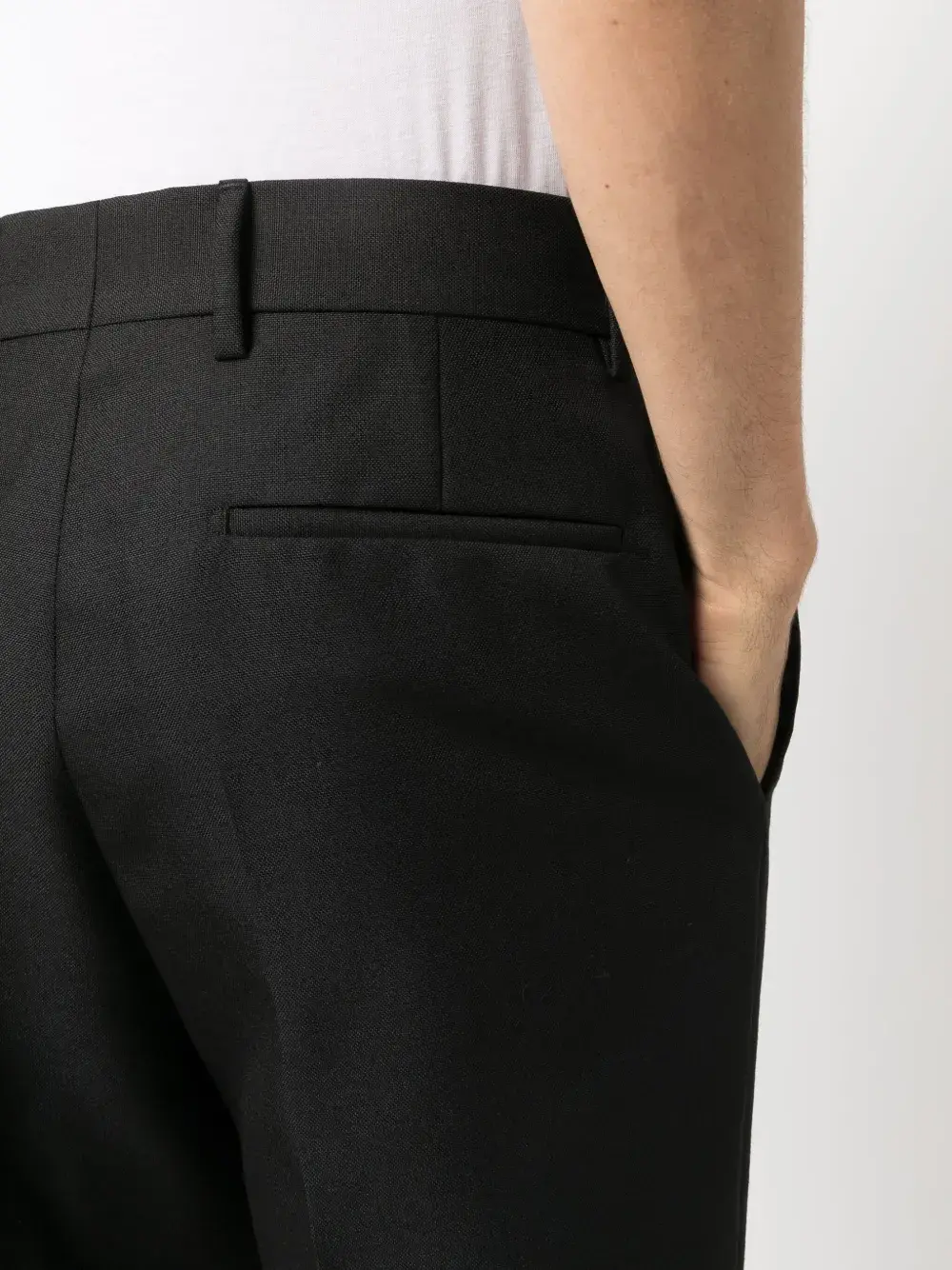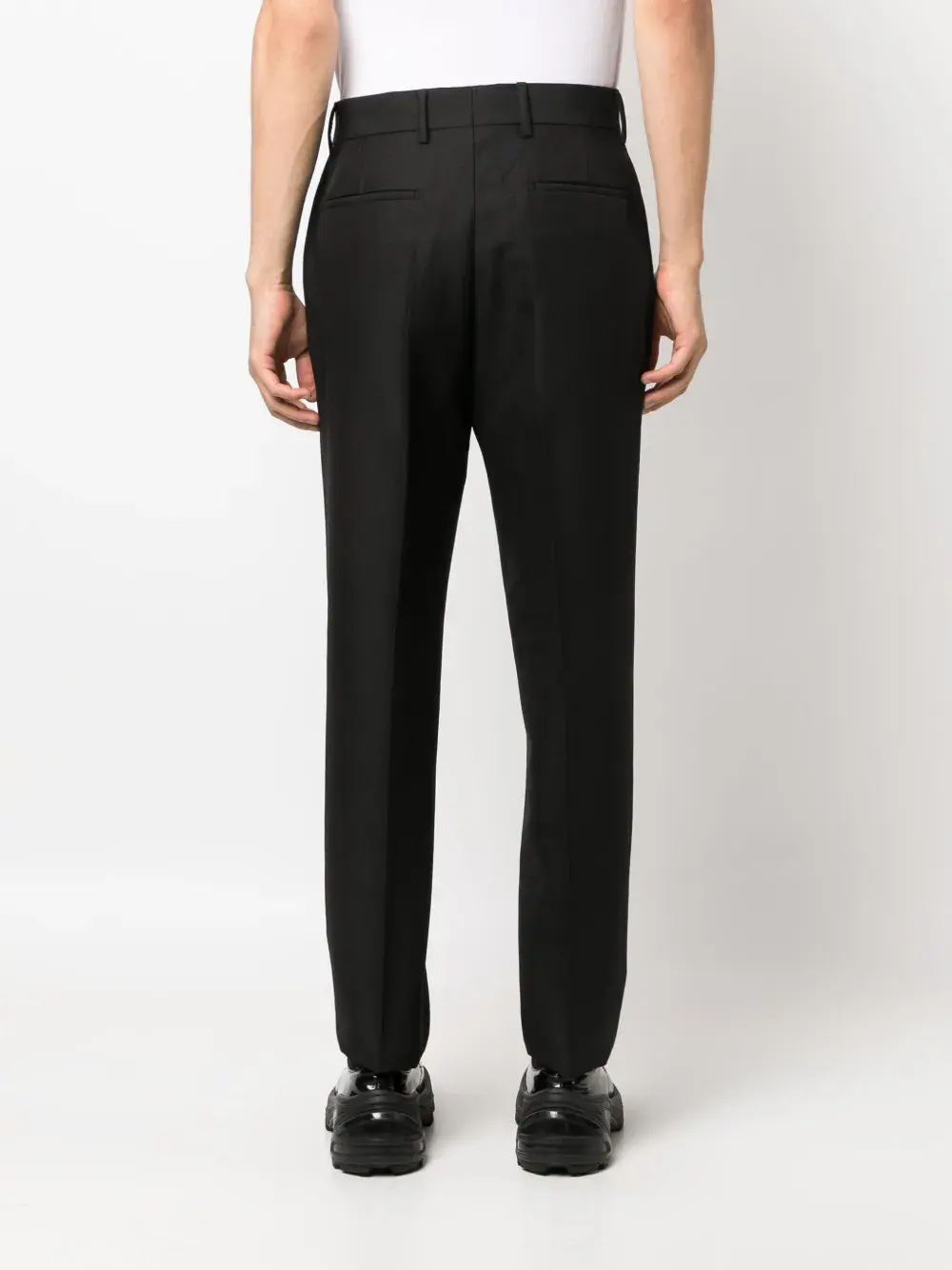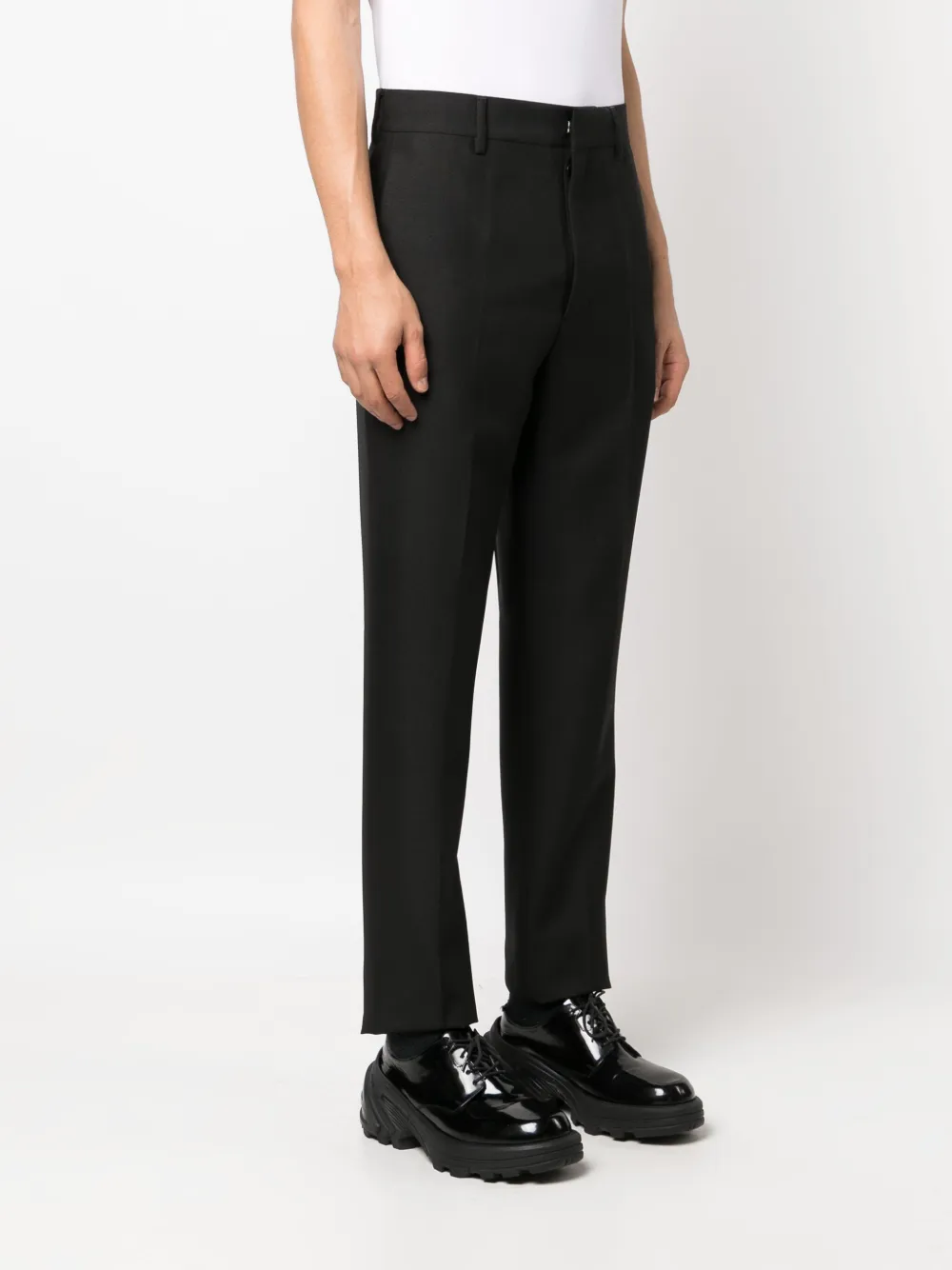 Черный, смесь шерсти и мохера, узкий крой, средняя посадка, петли для ремня, потайная застежка спереди, два прорезных кармана по бокам и два кармана с листочкой сзади.