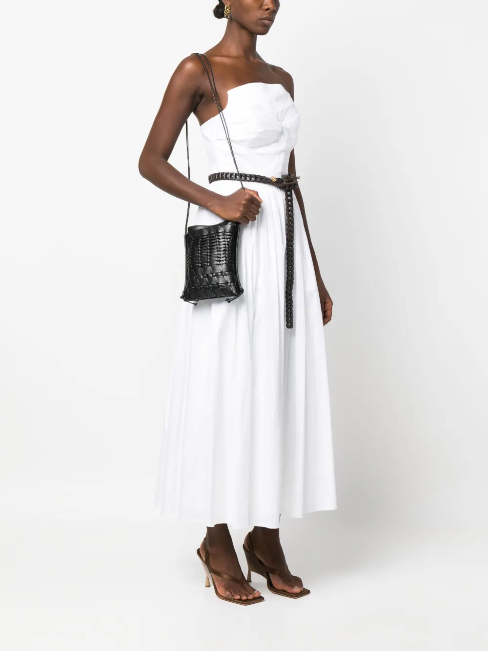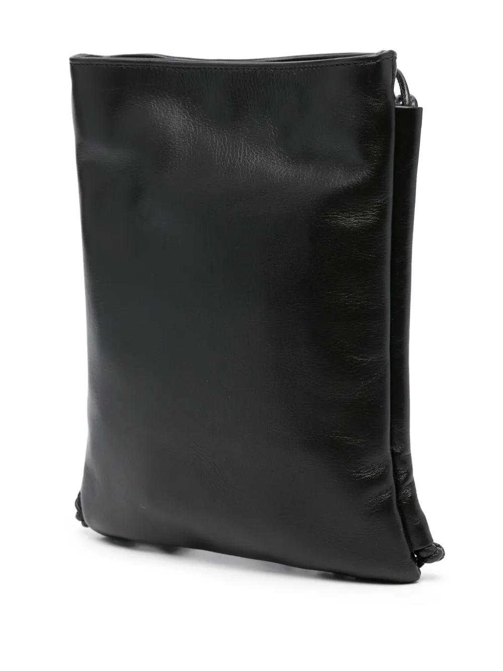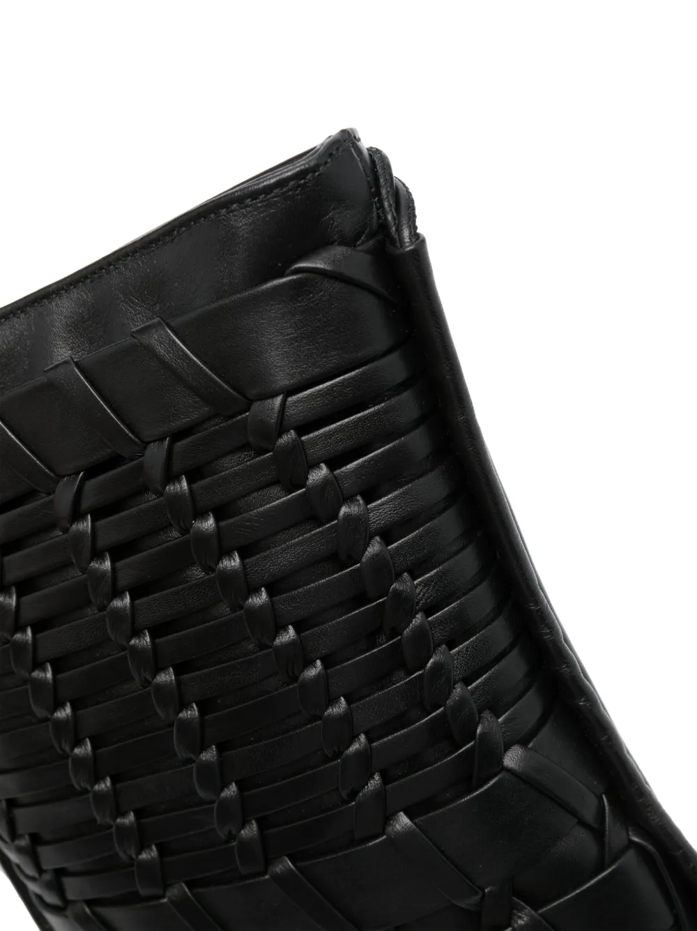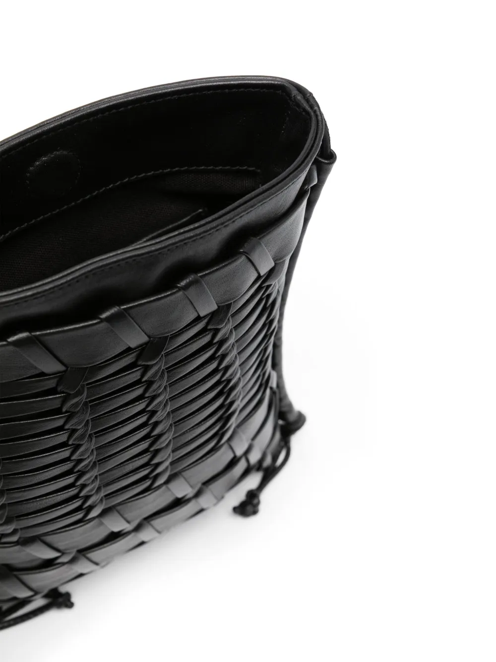 Черный, телячья кожа, переплетенный дизайн, потайная застежка на магните, две регулируемые бретели, основное отделение, внутренний прорезной карман и прорезной карман спереди.