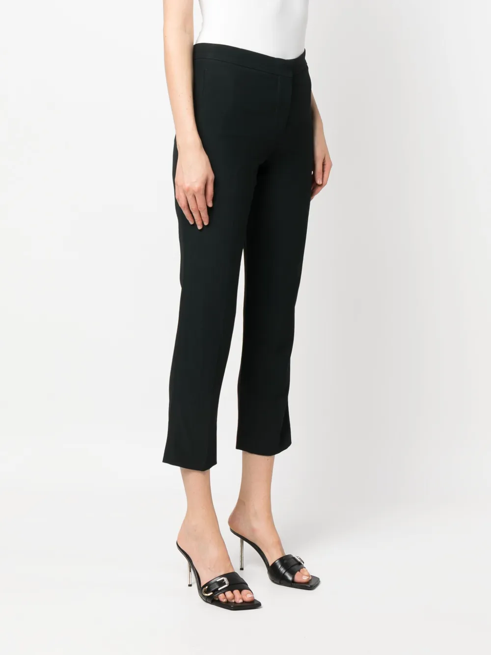 Черный, креповая текстура, стрелки, строгий крой, средняя посадка, потайная застежка спереди, два прорезных кармана по бокам, задние карманы с листочкой, укороченная длина и прямой крой.