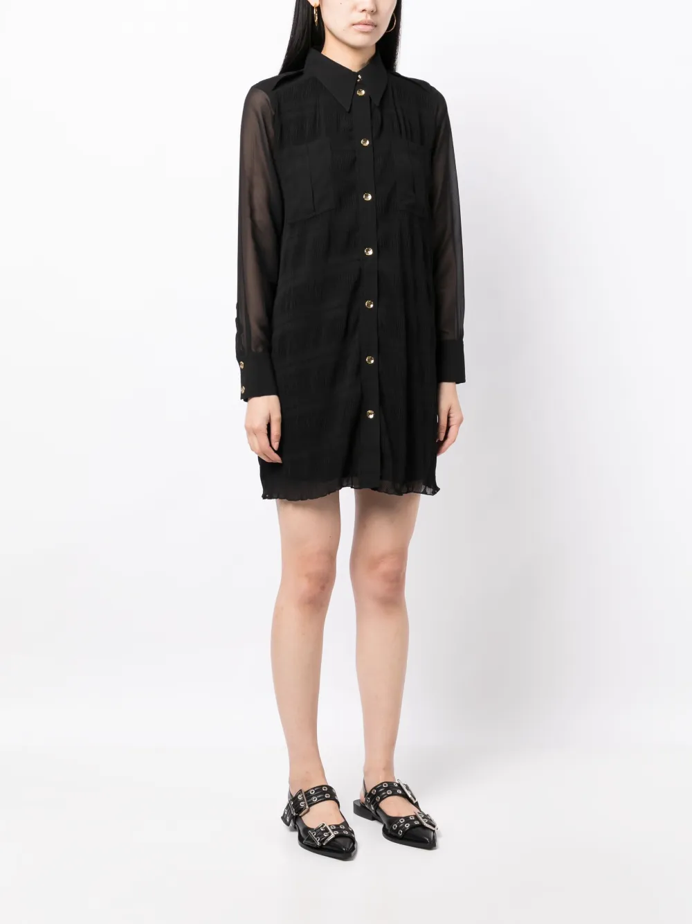 Подробнее о товаре: Черный, переработанный полиэстер, фактурная отделка, полупрозрачный дизайн, прямой воротник, застежка на пуговицах спереди, два накладных кармана на груди, длинные рукава, рукава с манжетами на пуговицах, прямой подол и длина до бедер. Этот товар как минимум на 50% состоит из переработанных или повторно использованных материалов. Узнать больше о том, какие товары получают отметку «Ответственный выбор», можно из материала «Как мы оцениваем экологичность и этичность».