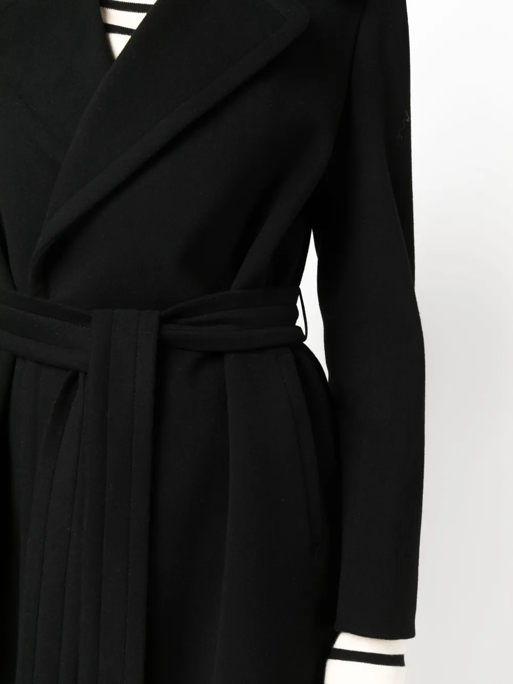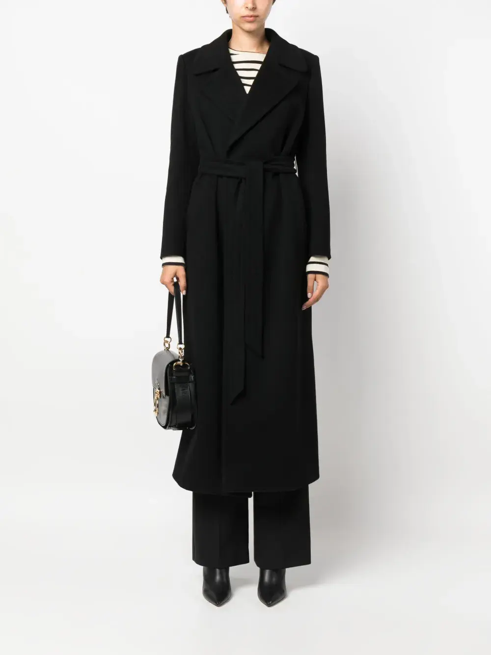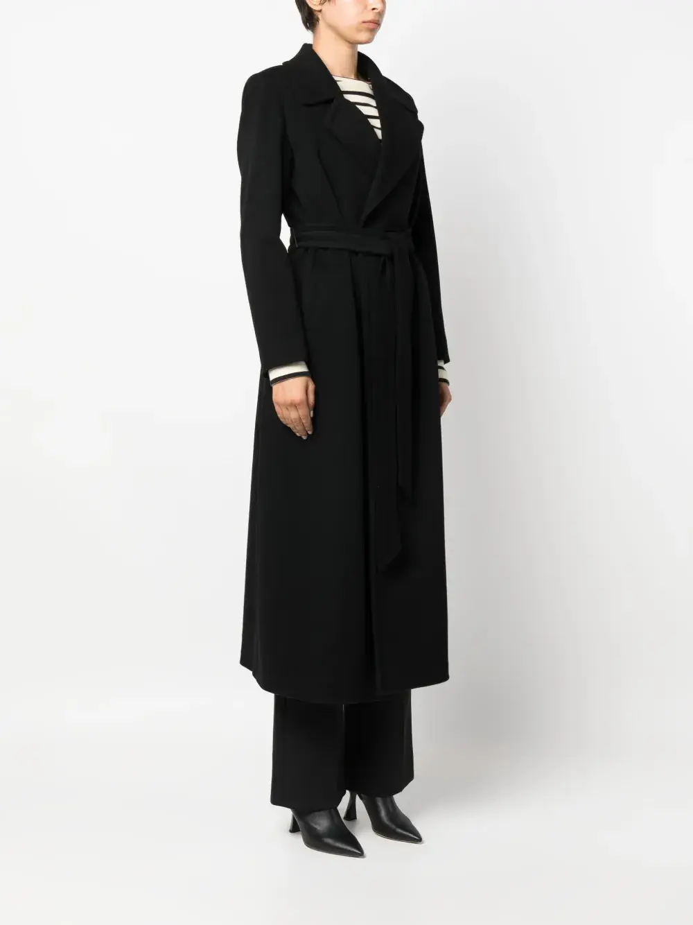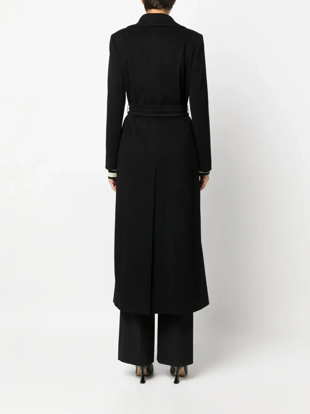 Черный, смесь шерсти и кашемира, широкие заостренные лацканы, двубортная застежка на кнопки, два боковых кармана с листочкой, ремень на талии, длинные рукава, шлица по центру сзади, прямой подол и длина миди.