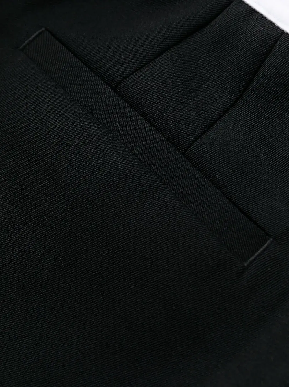 Черный/белый, шерсть, складки, эластичный пояс с логотипом, прямой крой, эластичный пояс, два прорезных кармана по бокам, два кармана с листочкой сзади и стрелки.