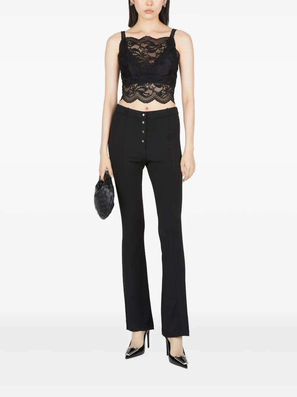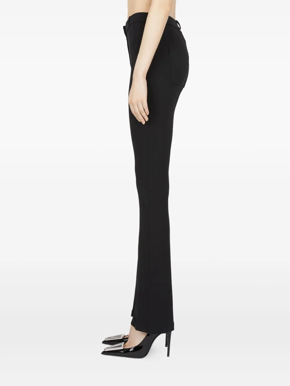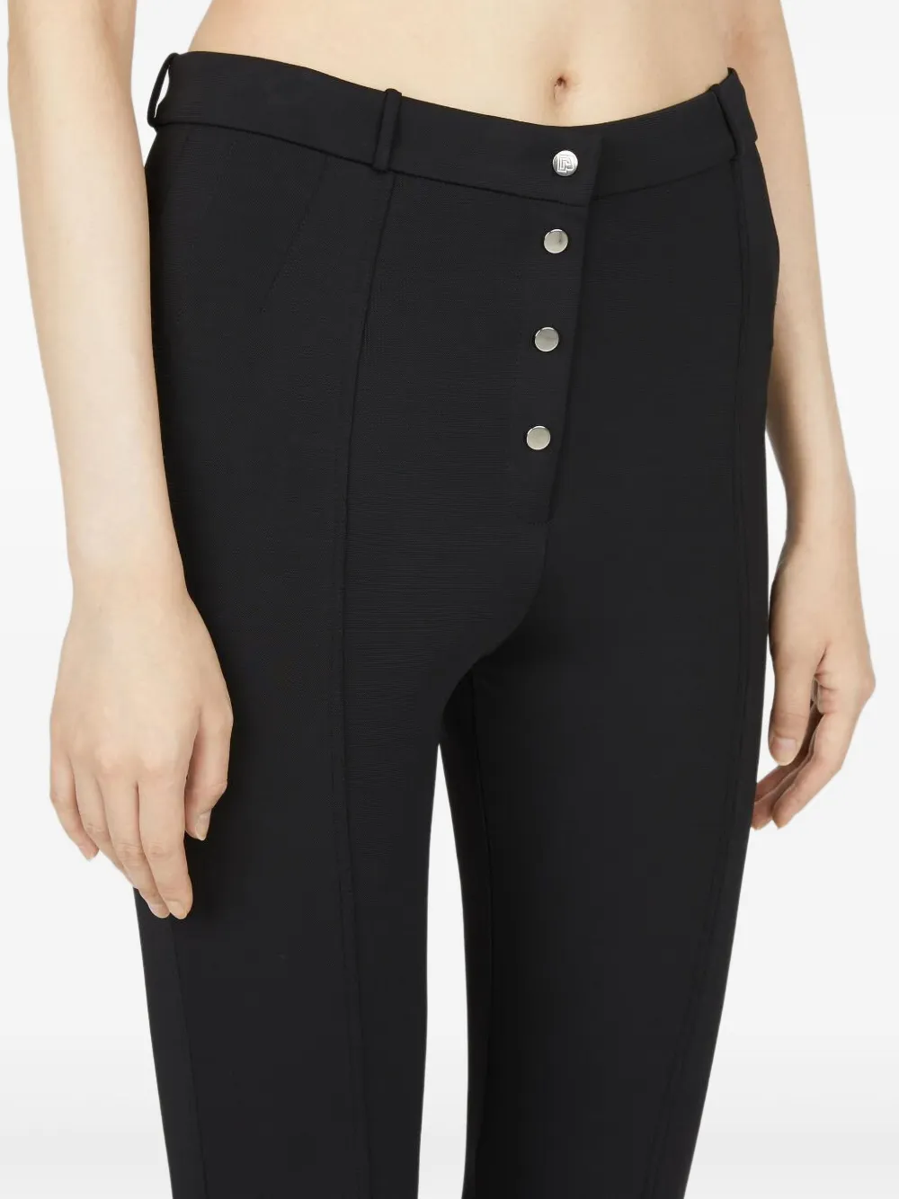 Черная потайная застежка на пуговицы, два накладных кармана сзади, шлевки для ремня, прямой подол