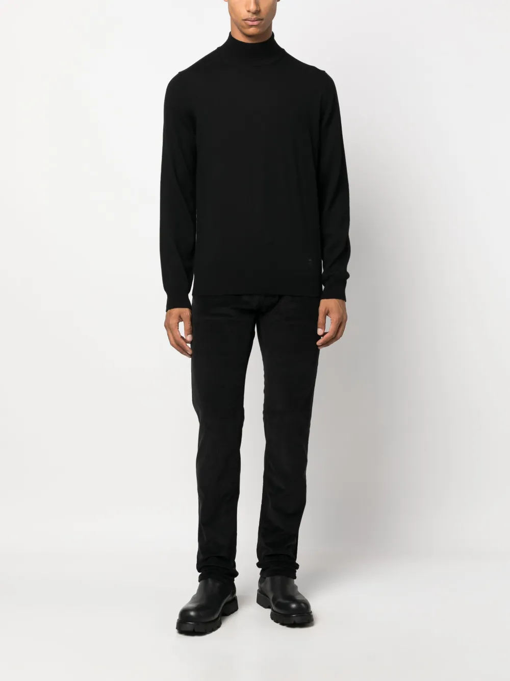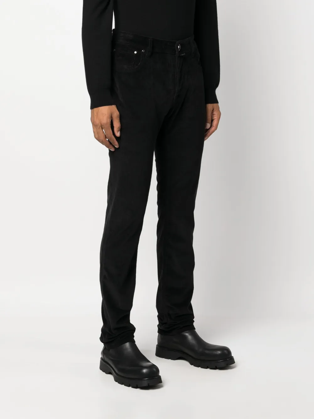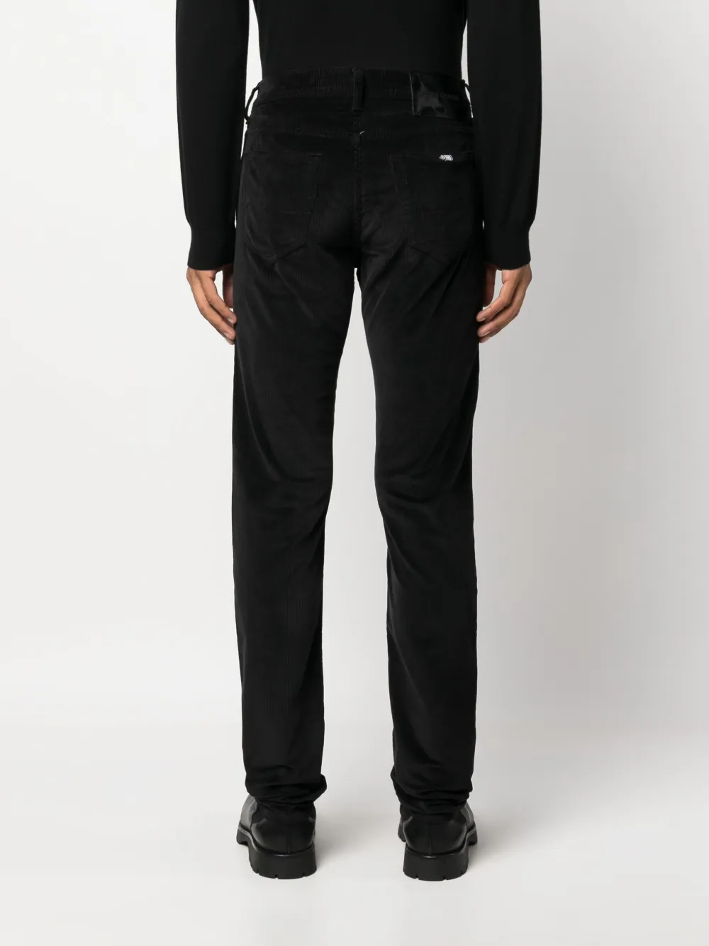 Черный, смесовый хлопок, нашивка с логотипом сзади, петли для ремня, застежка на молнии и пуговице спереди, прямой крой и пять карманов.