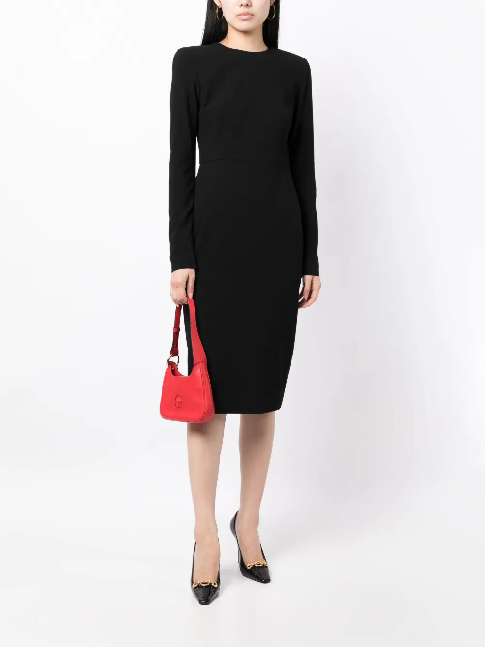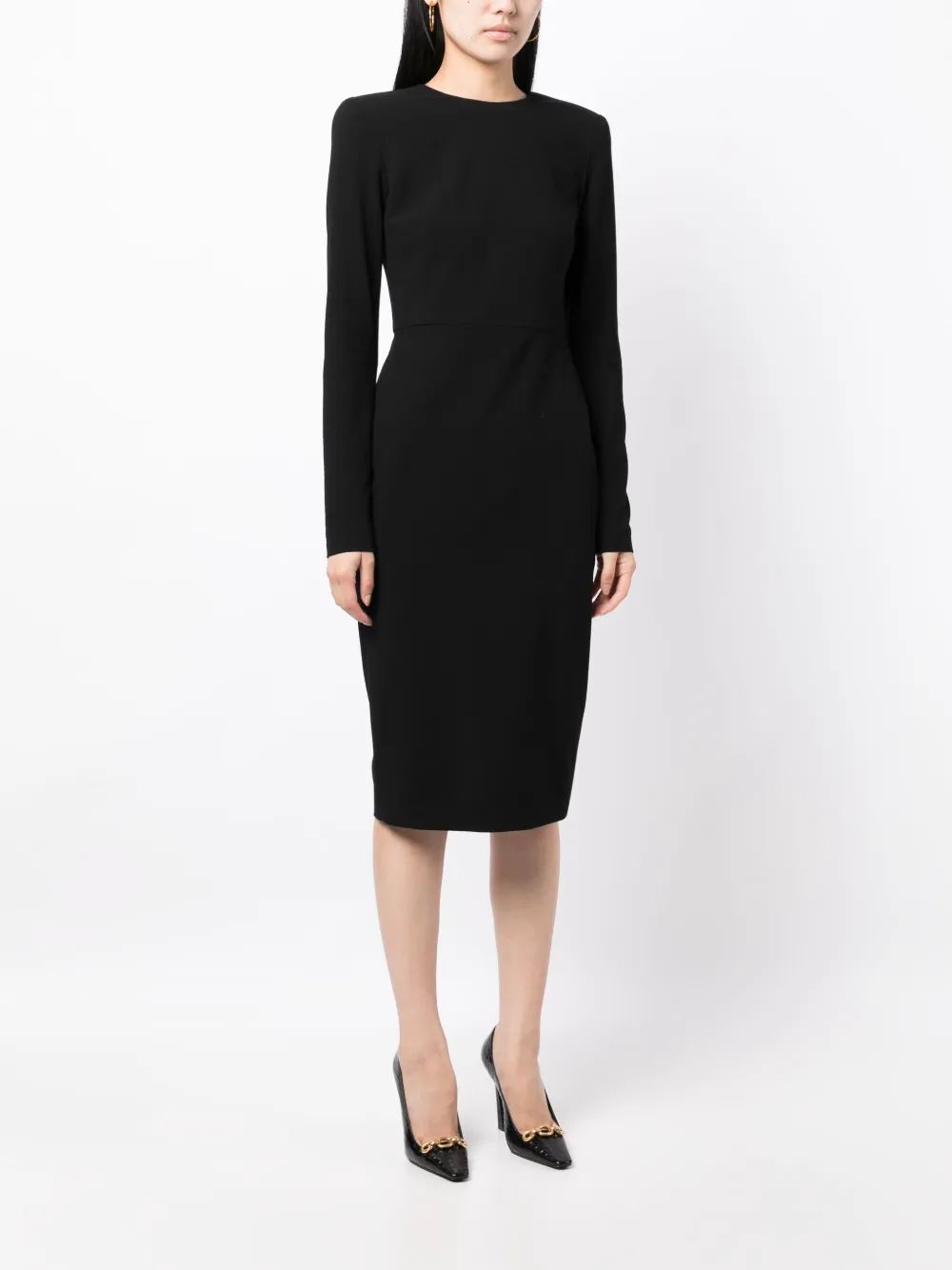 Черный, смесовая шерсть, эластичный материал, вырез сзади, круглый вырез, приталенный силуэт, застежка на молнии сзади, прямой подол и длина миди.