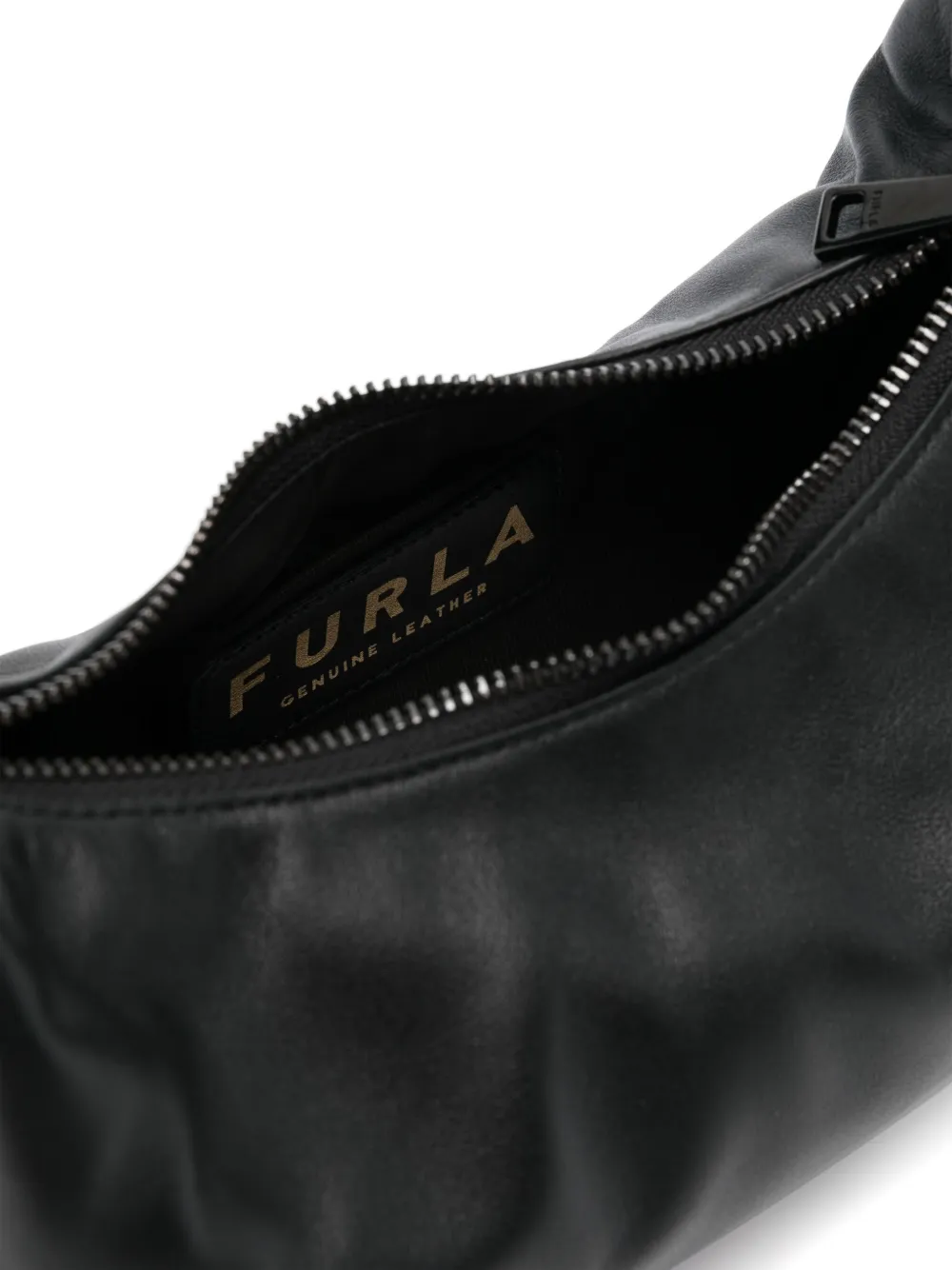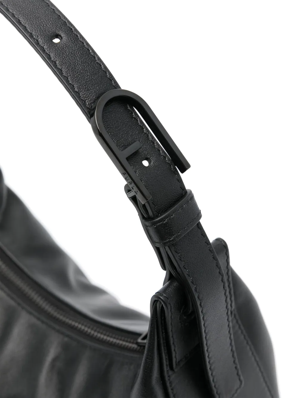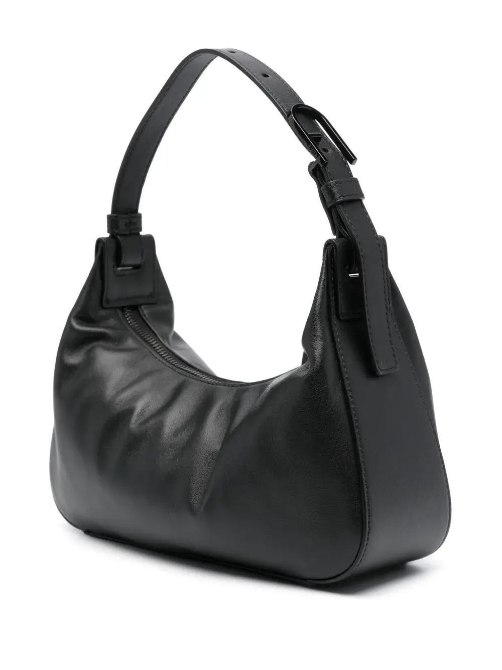 Расцветка Core Black, телячья кожа, зернистая текстура, логотип в тон, серебристая фурнитура, застежка на молнии сверху, регулируемый ремень на плечо, основное отделение и нашивка с логотипом внутри.