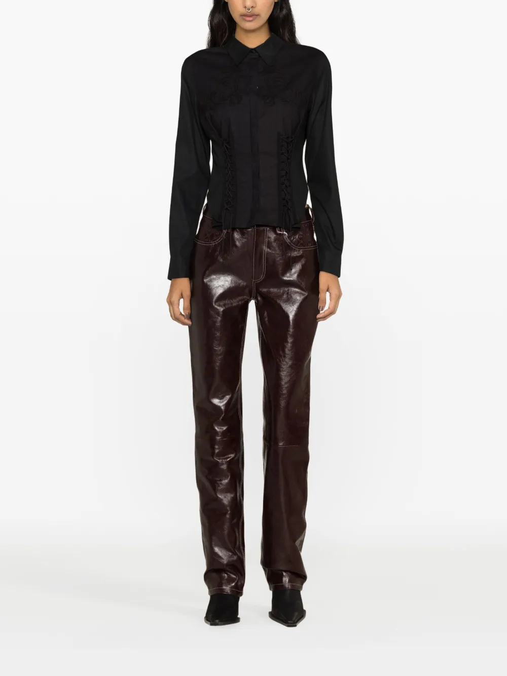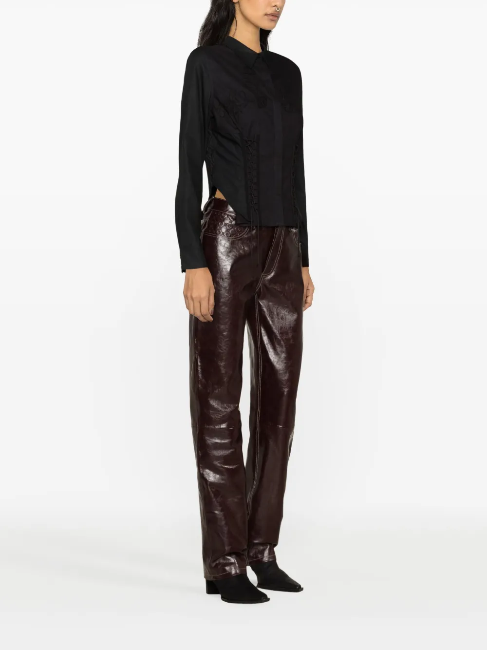 Черный, хлопок, вышивка, классический воротник, застежка на пуговицах спереди, верх в корсетном стиле, длинные рукава, манжеты на пуговицах и асимметричный подол.