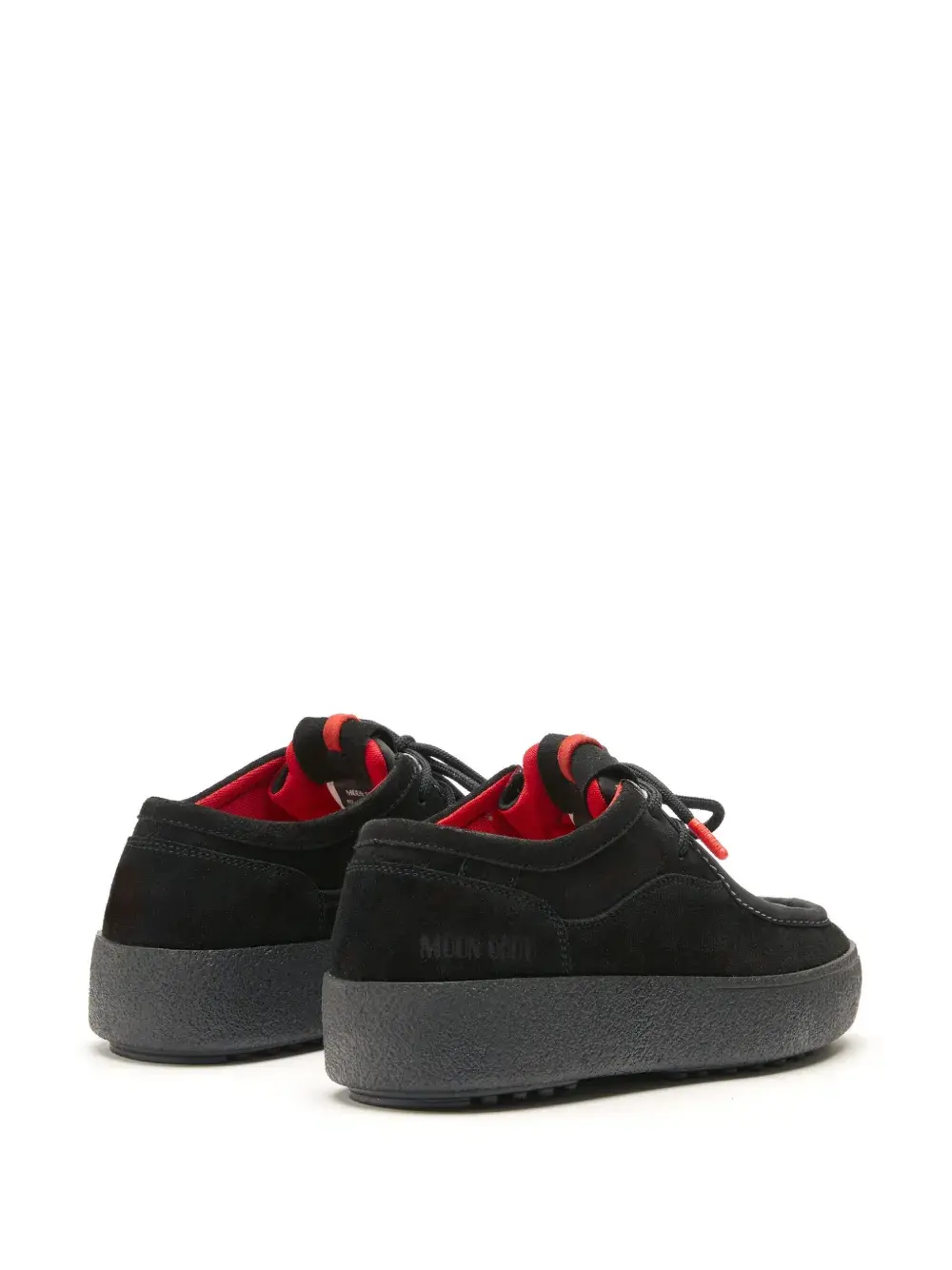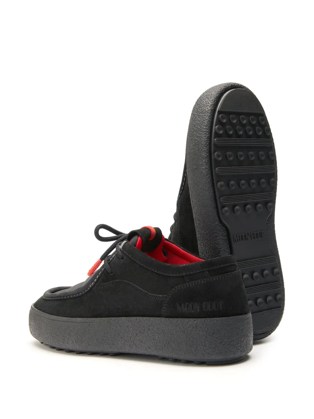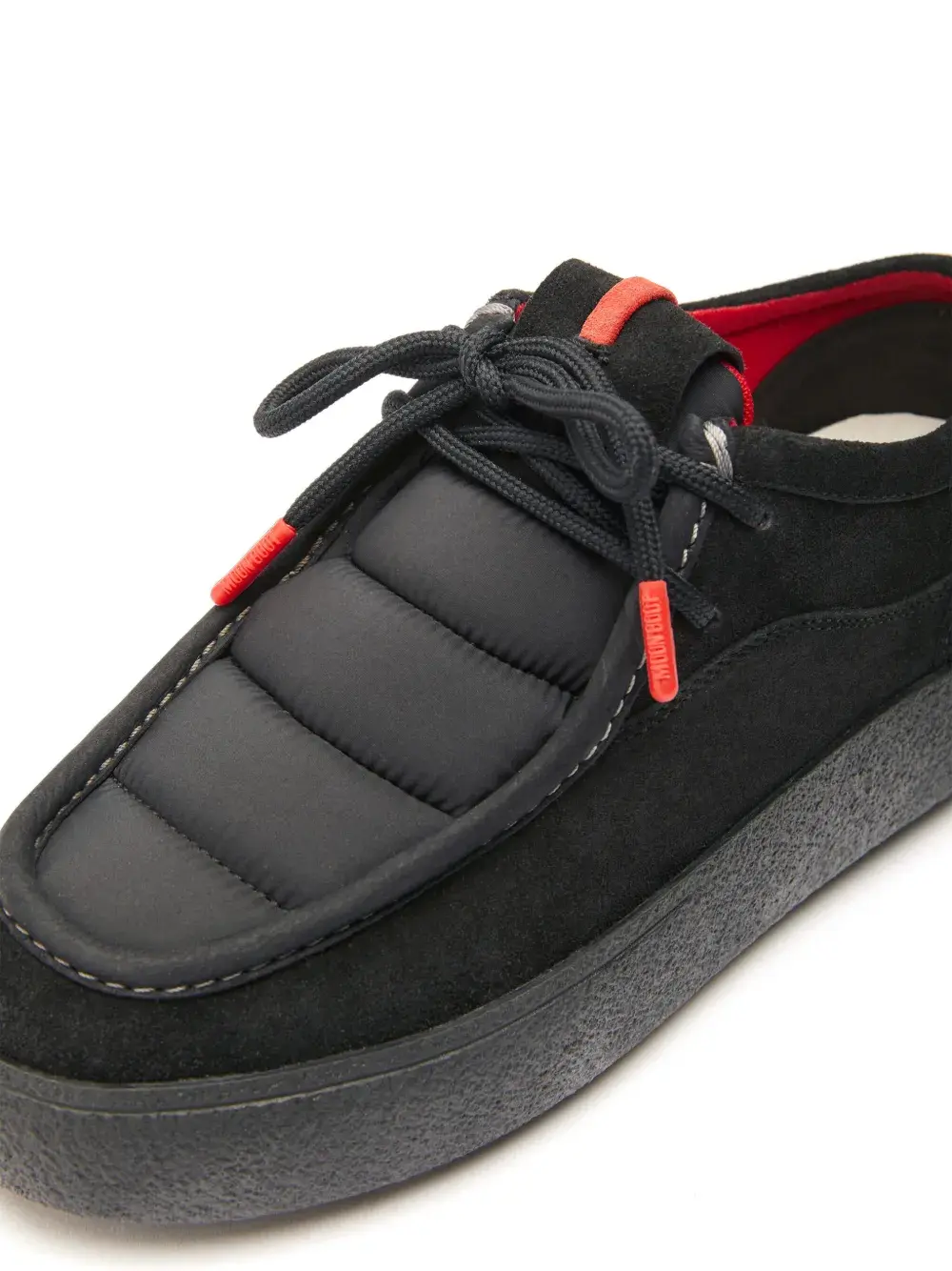 Черный, замша из телячьей кожи, вставки, дутые вставки, тисненый логотип сбоку, закругленный носок, шнуровка спереди и плоская резиновая подошва.