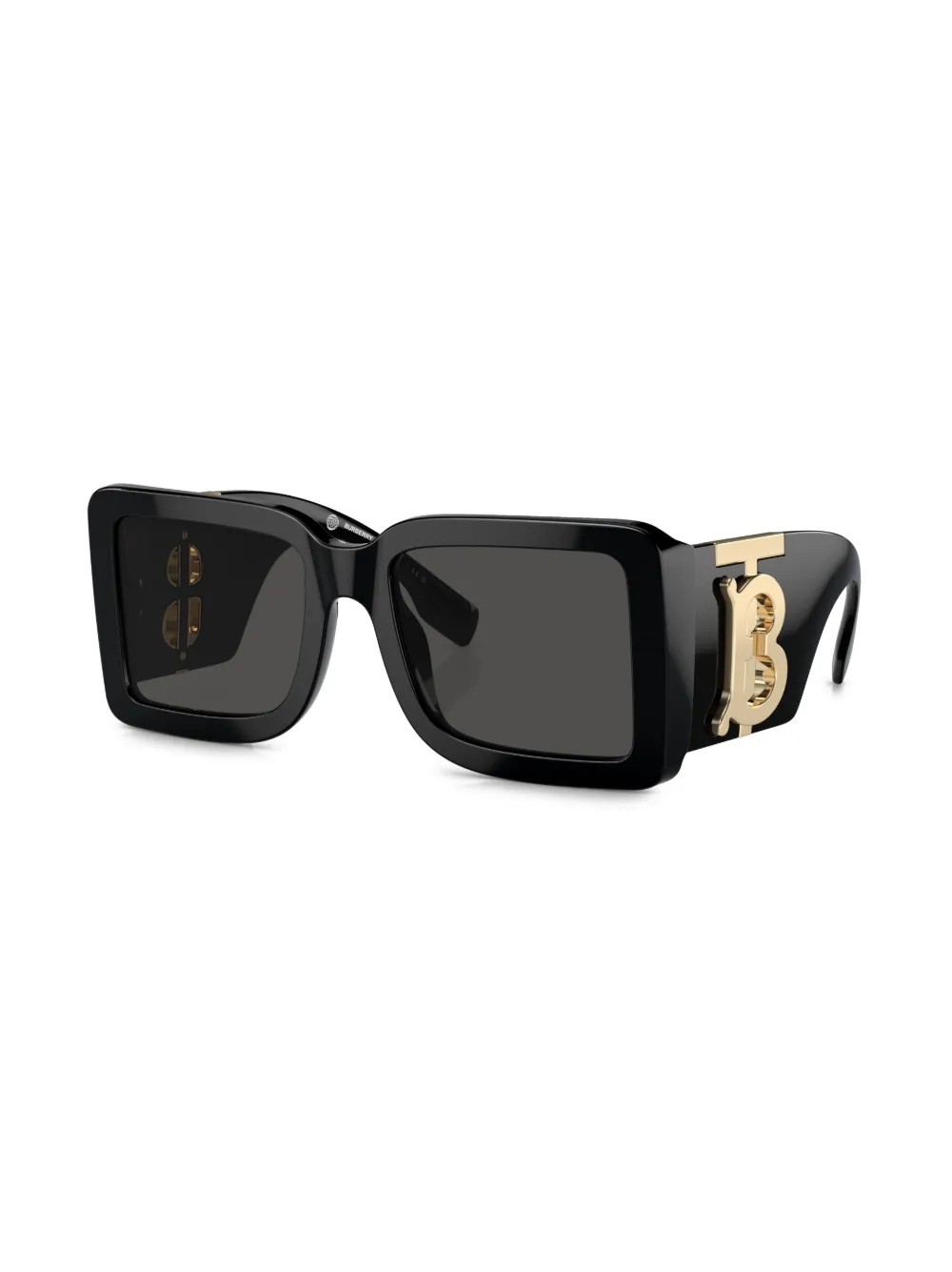 Золотистая фурнитура, декор в виде логотипа с монограммой TB, квадратная оправа, затемненные линзы, широкие дужки и прямые наконечники дужек. В комплект входит защитный чехол для очков.