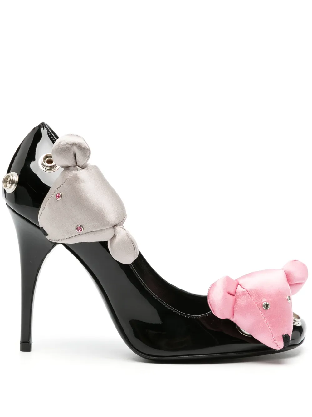 Черный, серо-коричневый, нежно-розовый, телячья кожа, лакированная отделка, квадратный носок, кожаная стелька с логотипом, изображение медведя, заклепки и каблук на высокой шпильке.