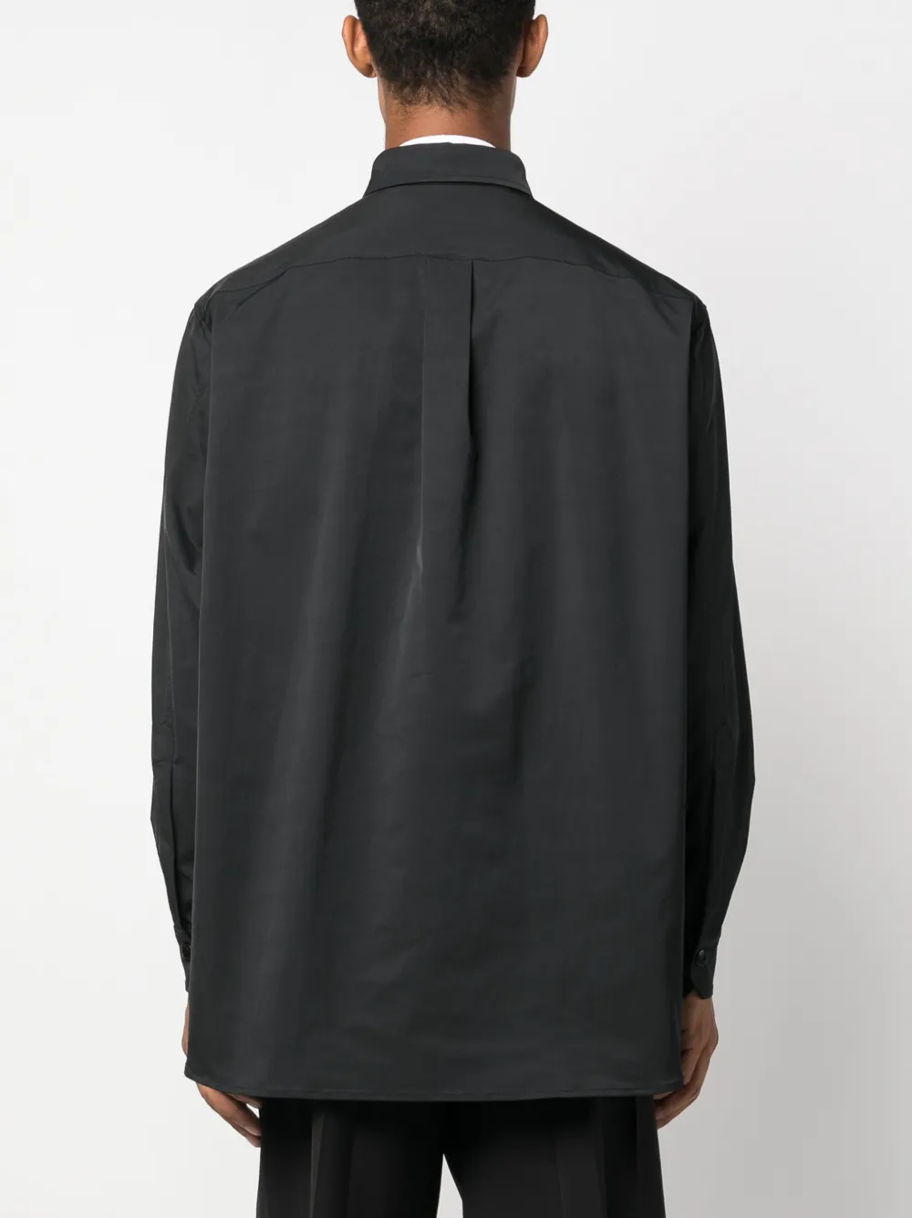 Черный, технологичная ткань, классический воротник, потайная застежка спереди, длинные рукава, манжеты на пуговицах и закругленный подол.