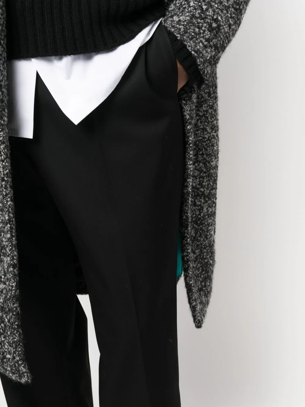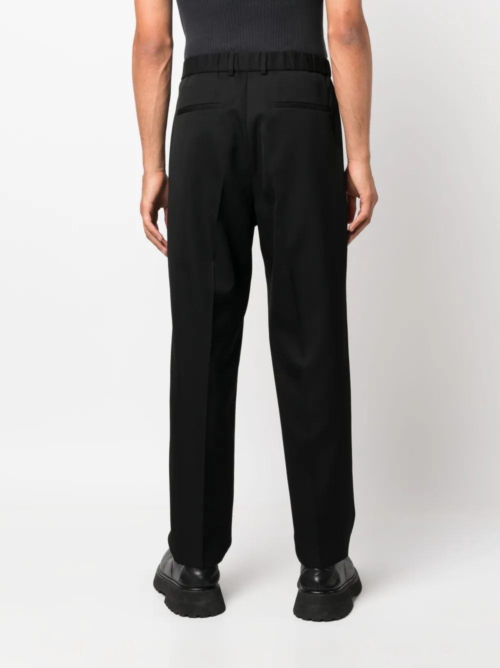 Черный, необработанная шерсть, хлопок, прямой крой, средняя посадка, эластичный пояс сзади, потайная застежка спереди, петли для ремня, два прорезных кармана по бокам, два кармана с листочкой сзади и стрелки.