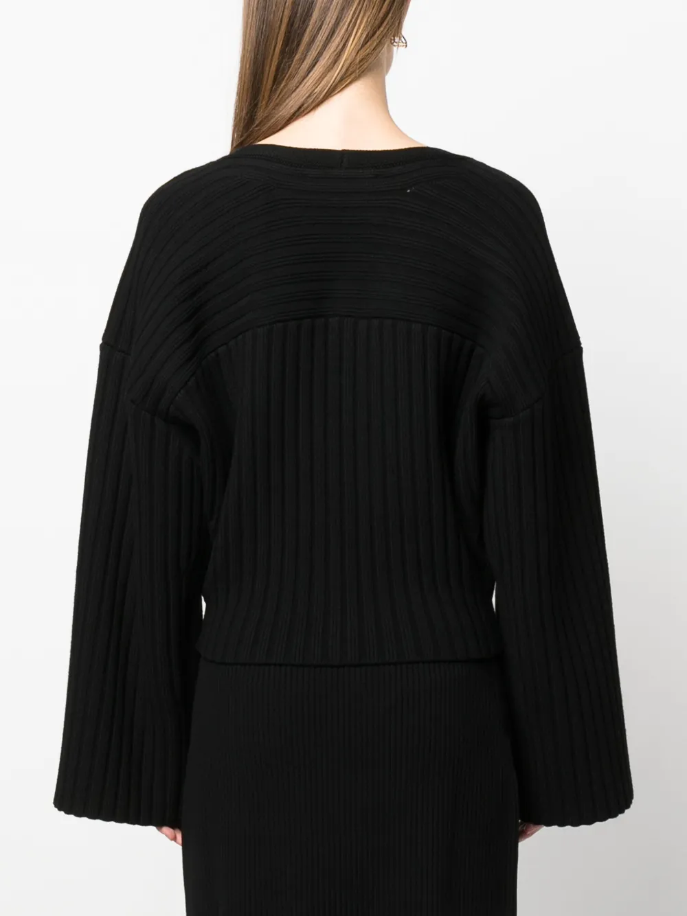 Подробнее о товаре: Черный, трикотаж в рубчик, круглый вырез с разрезом, застежка на пуговицах спереди, приспущенные плечи, длинные широкие рукава, прямой подол и укороченная длина. Этот товар как минимум на 50% состоит из сертифицированной древесины. Это гарантирует, что сырье заготовлено в ответственных лесных хозяйствах, которые минимизируют вырубку лесов, обеспечивают справедливую заработную плату и условия труда, сохраняют биоразнообразие и уважают права локальных сообществ.