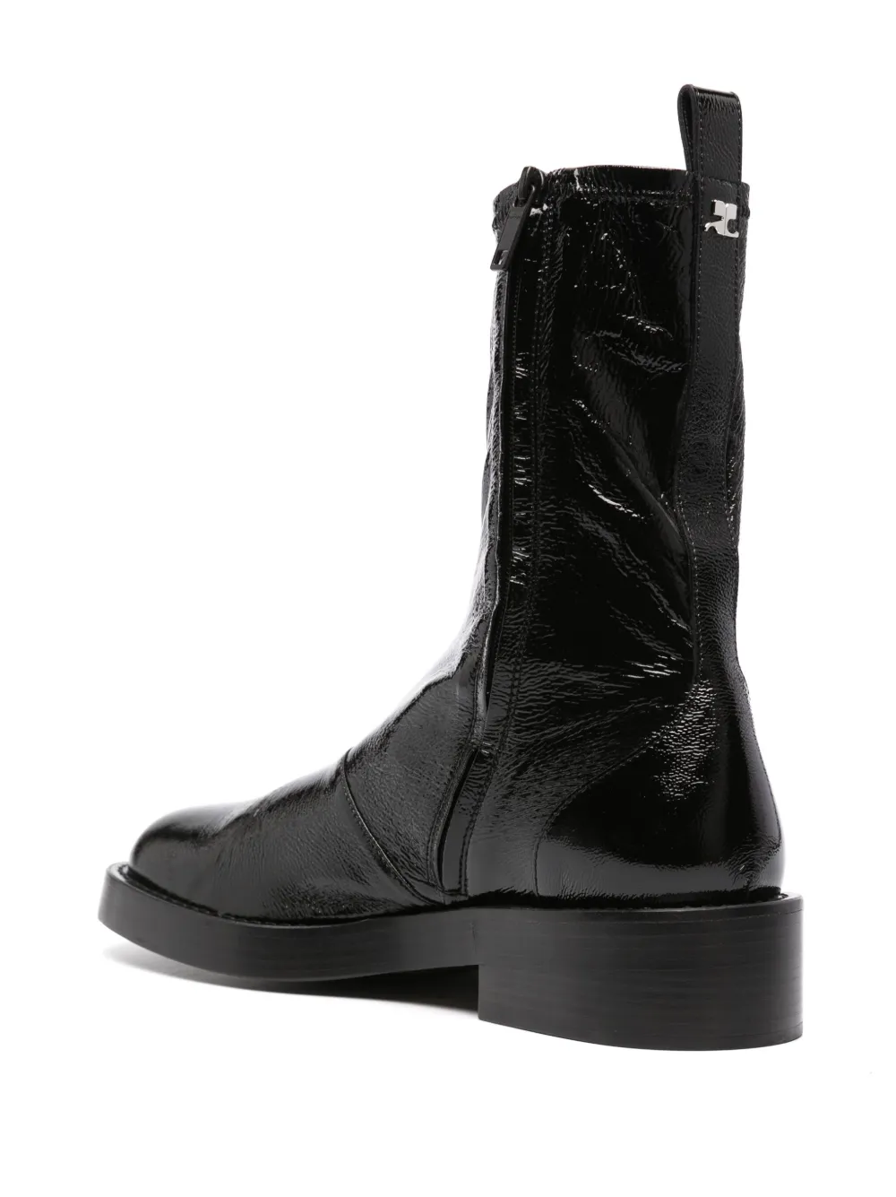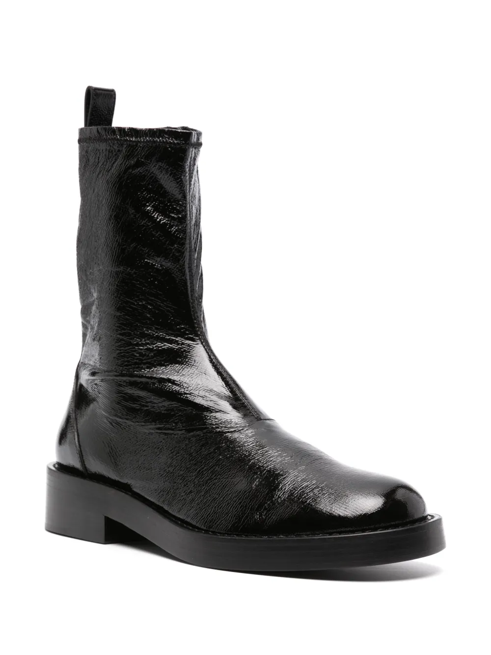 Черный, телячья кожа, покрытие с эффектом кракле, лакированное покрытие, серебристый металлический логотип, закругленный носок, застежки на молнии сбоку, петля для подтягивания сзади и плоская резиновая подошва.