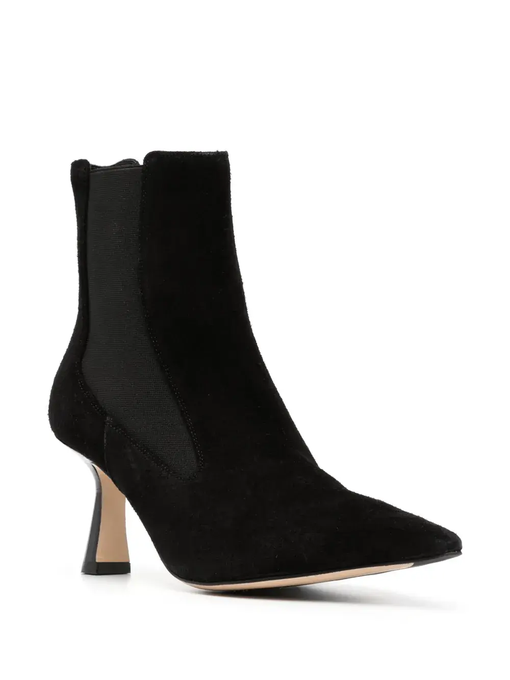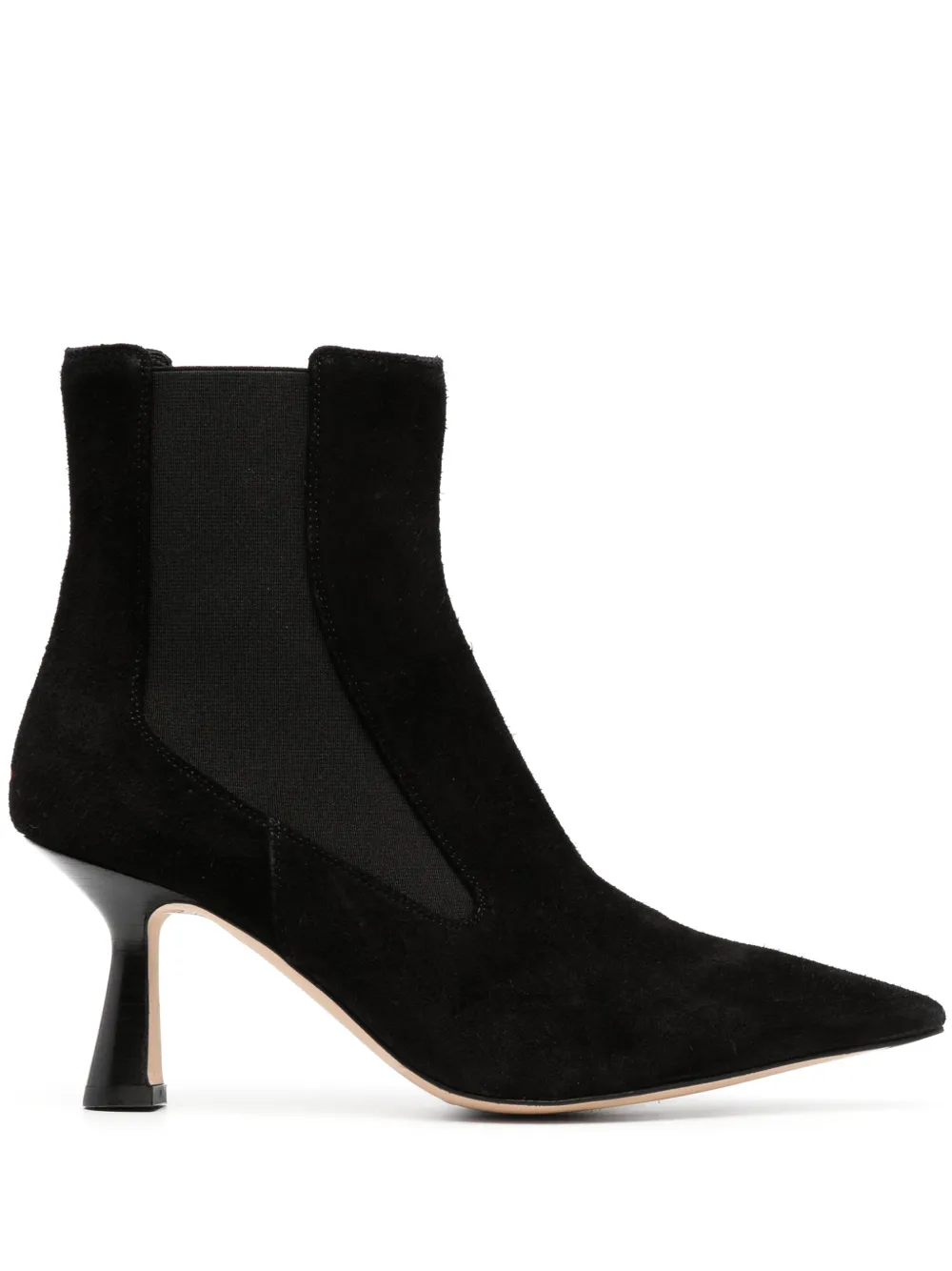 Черный, телячья кожа, овечья кожа, эластичные боковые вставки, застежки на молнии сбоку, резиновая подошва и заостренный носок.