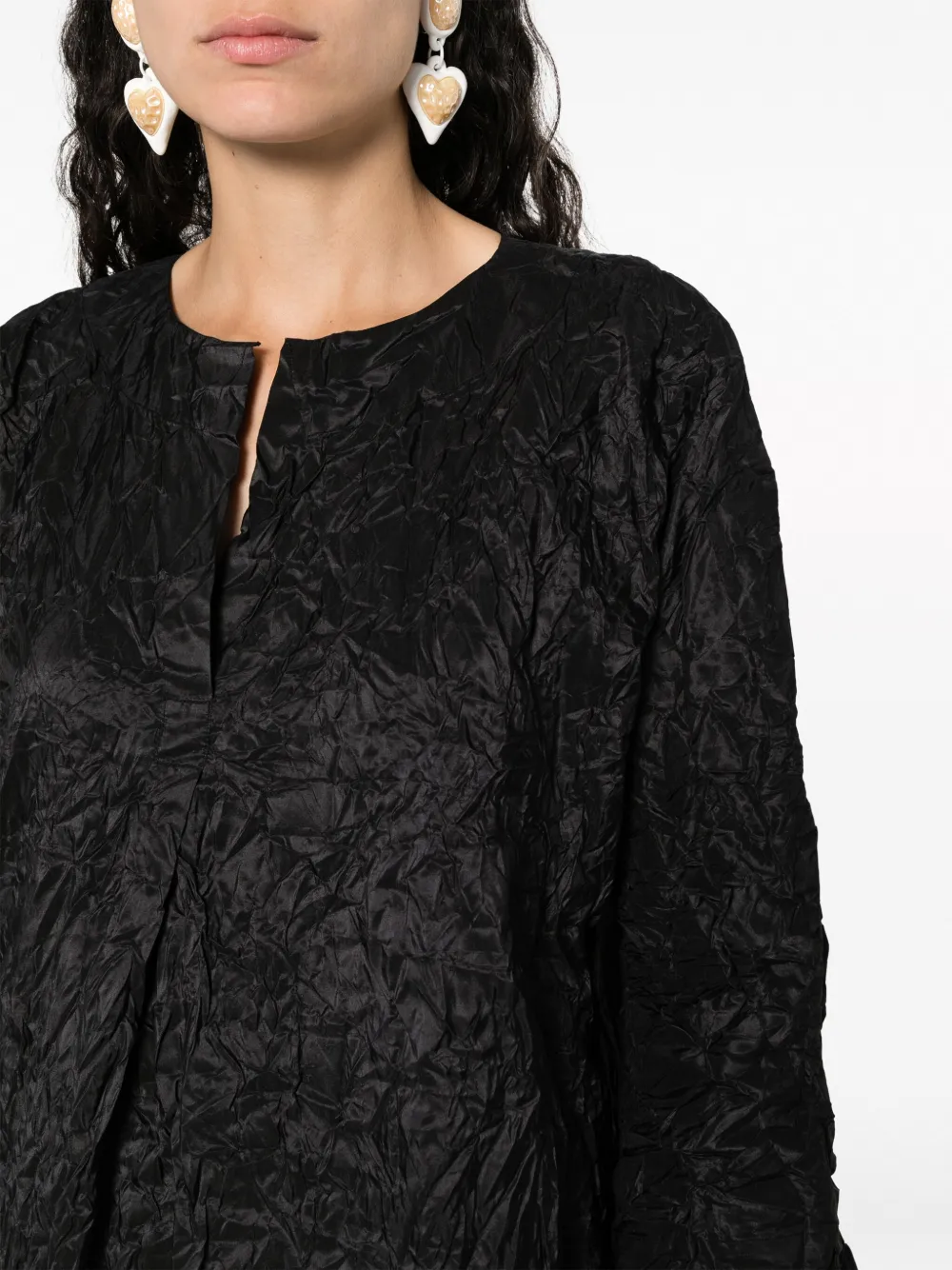 Сатиновая фактура, жатый эффект, круглый вырез с разрезом, рукава три четверти и необработанные края.