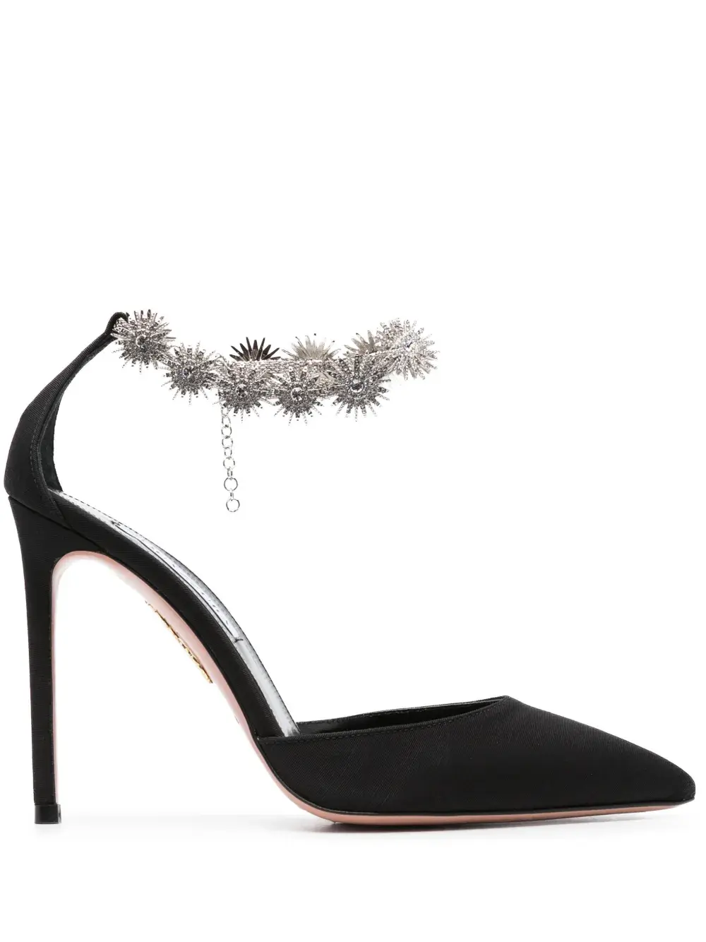 Ремешок на щиколотке с отделкой кристаллами, застежка-карабин, регулируемая длина цепочки, кожаная стелька с логотипом и высокий каблук.