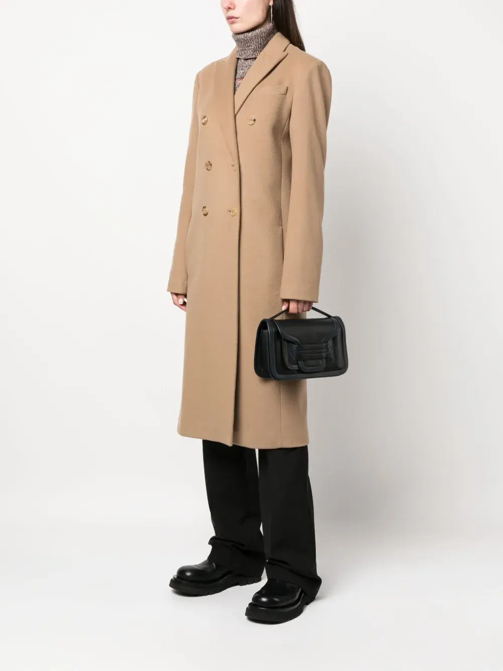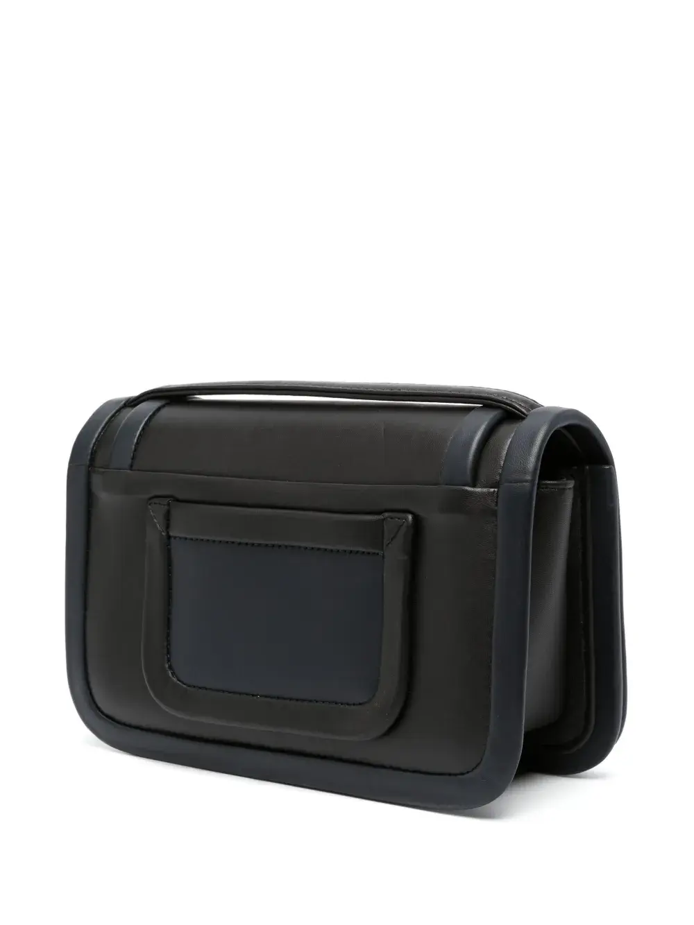 Черный, темно-синий, овечья кожа, сочетание двух оттенков, тисненый логотип внутри, откидной клапан, застежка на пряжке, зеркальная бирка, верхняя ручка, съемный регулируемый ремень на плечо, основное отделение и прорезной карман сзади.