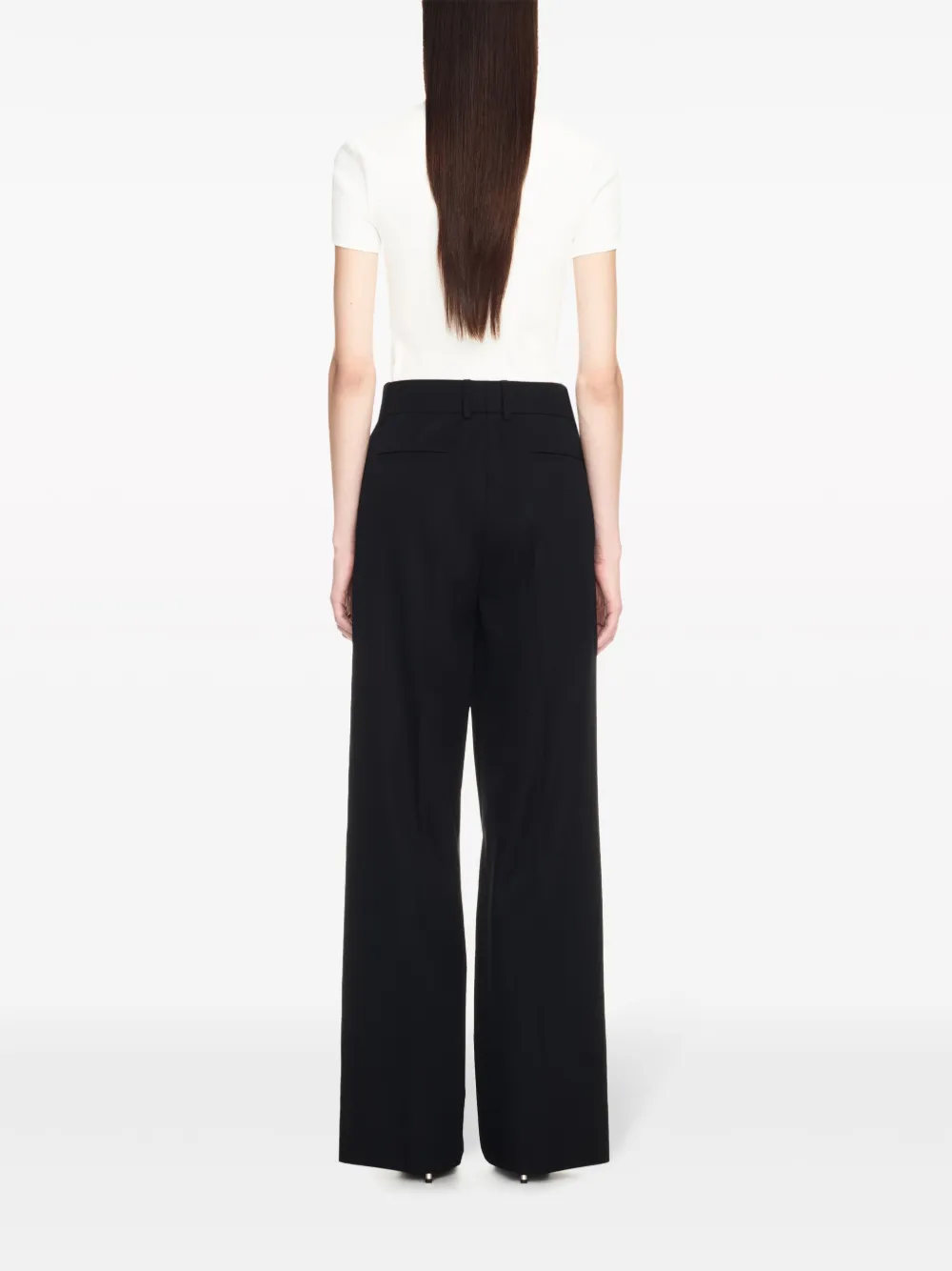 Черный, шерсть, строгий крой, вышитый логотип, завышенная талия, петли для ремня, потайная застежка спереди и прямой крой.
