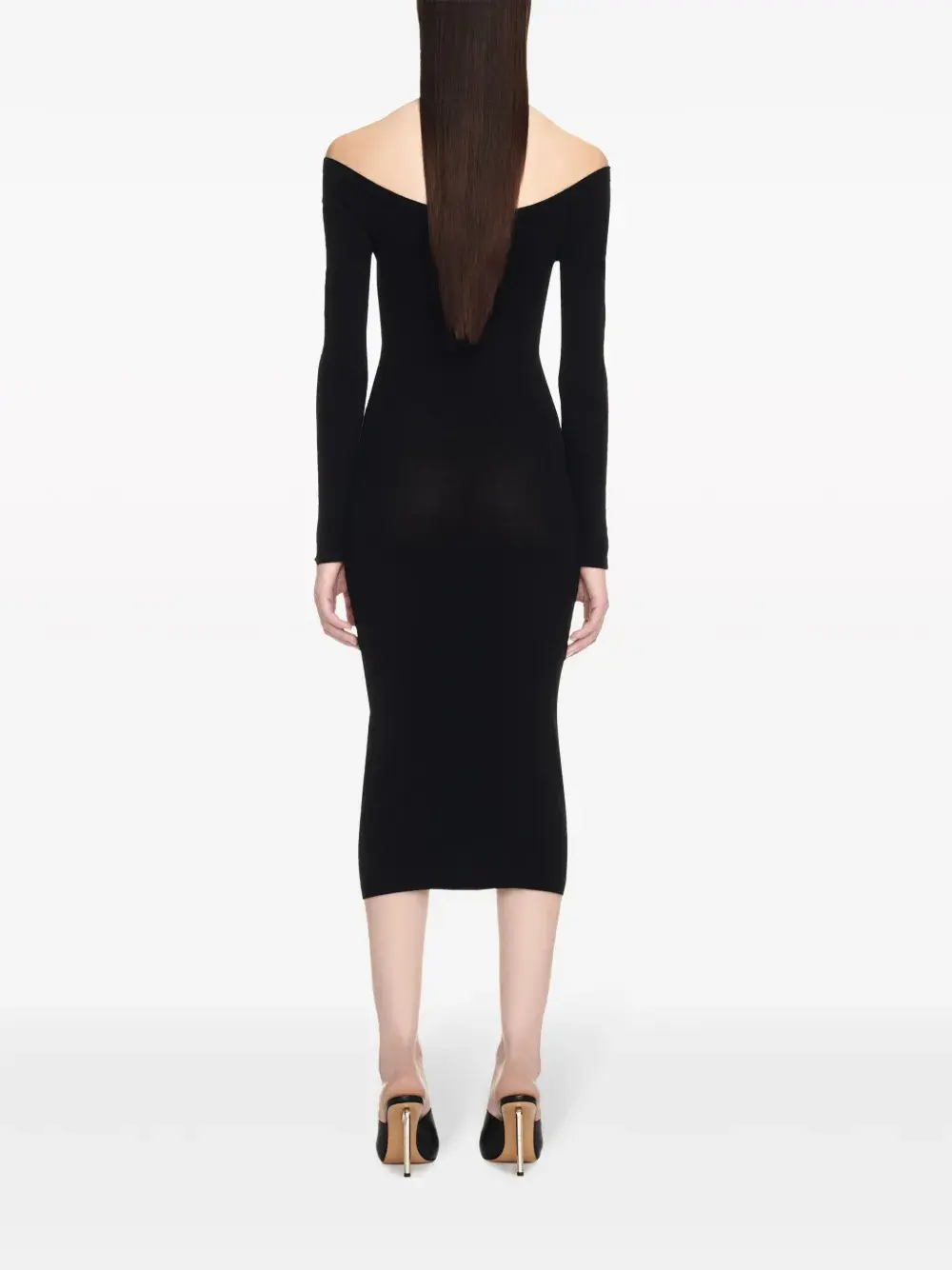 Черный, логотип спереди, открытые плечи, длинные рукава, длина миди и прямой подол.